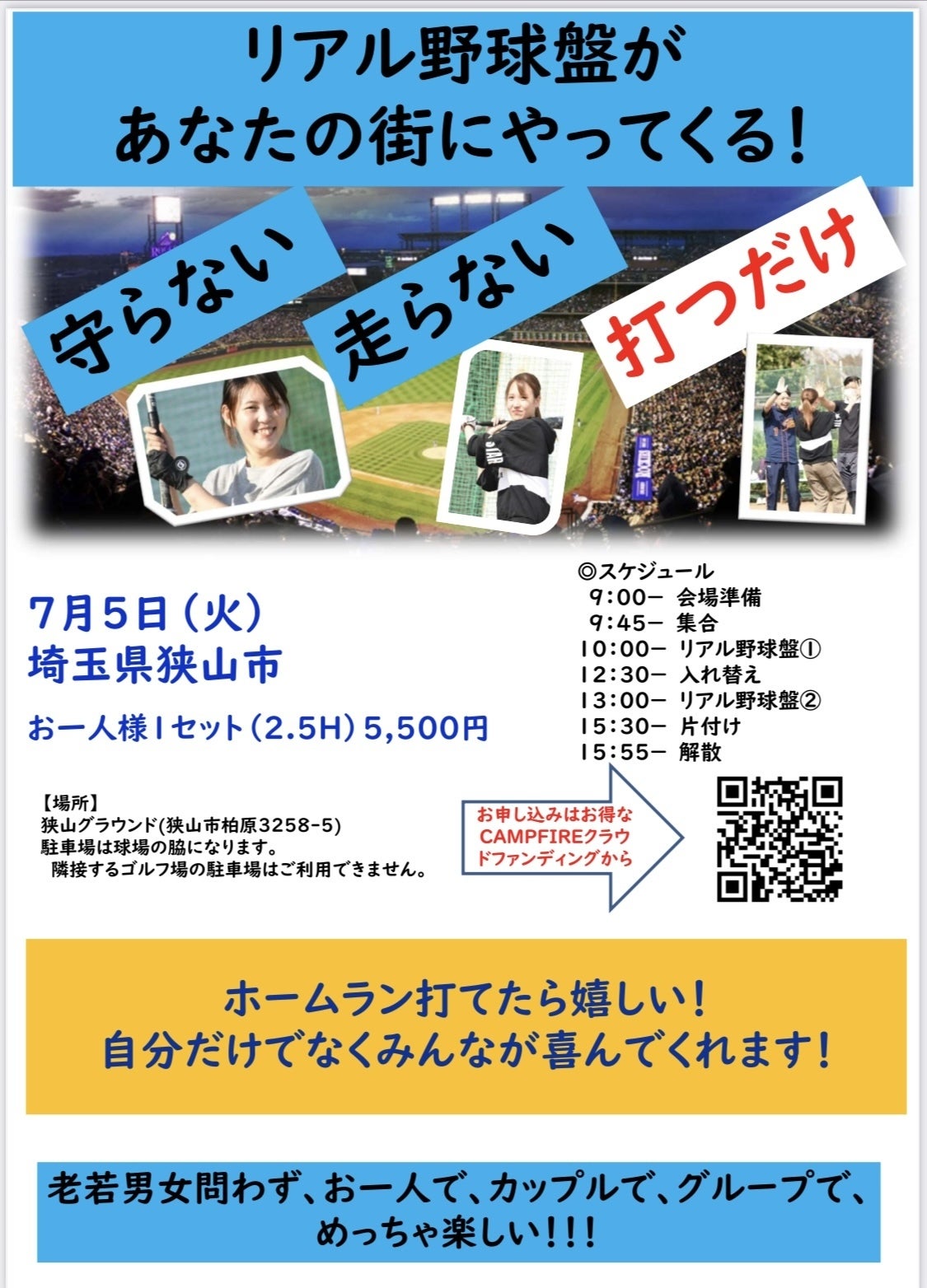 本日もご支援ありがとうございます。7月5日火曜日、埼玉県狭山市での開催が決定しました。狭山では、バッティングマシンを使ったリアル野球盤が楽しめます。埼玉県狭山市では、すでに5回ほど開催をしておりまして、グラウンド特有のルールもあり、そこが楽しみの一つともなっています。本日も多数のご支援をいただきました。周りの方へのお声かけもしていただきありがとうございます。最後まで頑張ります。