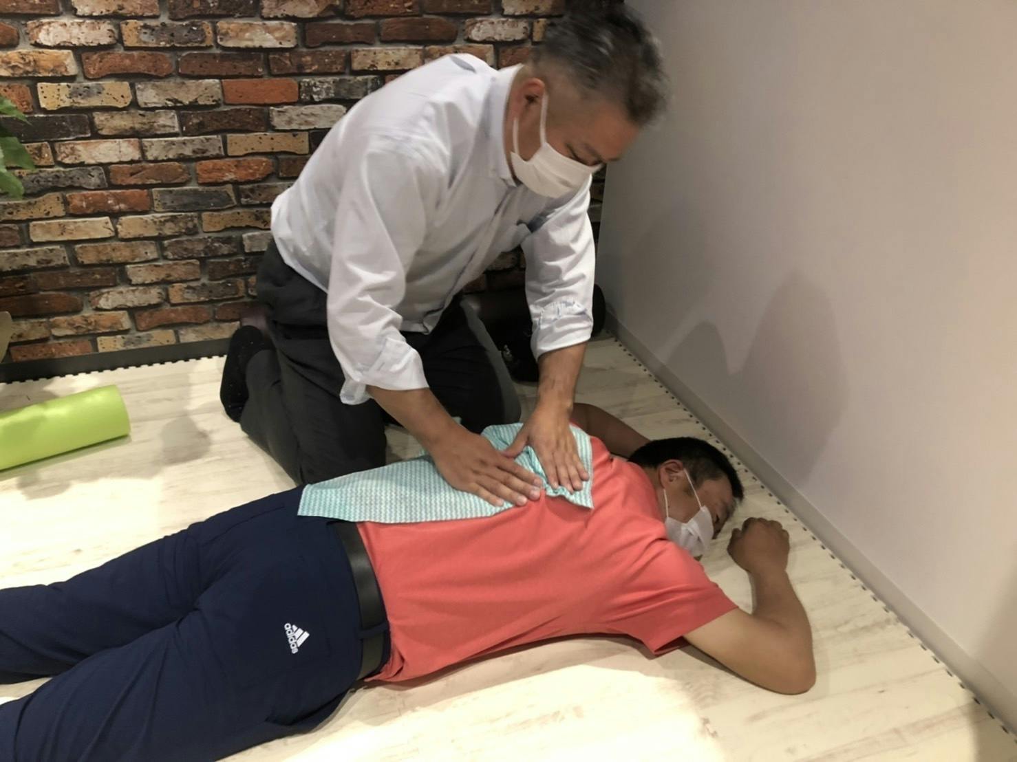 お客様としてお越しの、ヨガインストラクターの女性が、腰が痛いとのことで、筋膜リリースを椅子に座っていただき、簡易施術させていただきました。「痛くなくなりました!」と嬉しい声‼︎それを聞いた社長も、左肩が痛いと言われ、それでは、ということで、写真の通り、ストレッチコーナーで施術させていただきました。「楽になった」と嬉しい声‼︎
