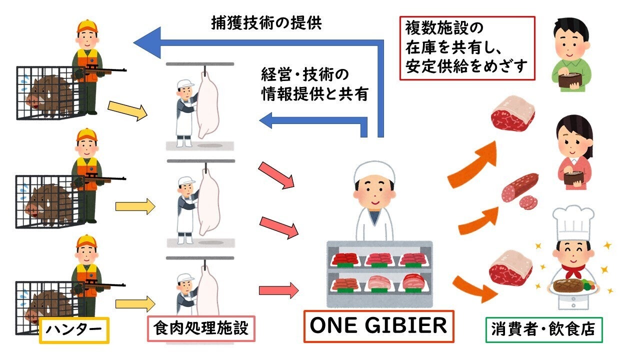 私たちのプロジェクト名は“ONE GIBIER(ワン・ジビエ)”。全国のジビエ生産者やハンターが「一つにまとまって挑む!」という想いを込めています。ジビエの好循環を作ることで地域活性化と獣害対策に貢献します!