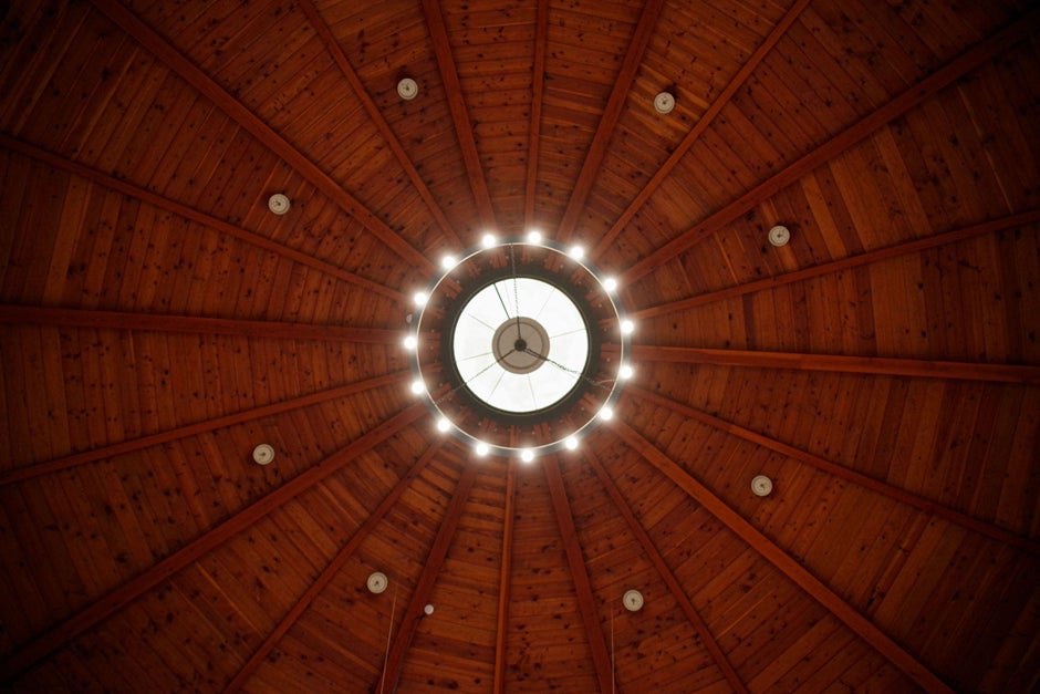 The domed ceiling of the hall is entirely covered with spruce, a type of guitar wood, making the entire building look like a musical instrument. Visitors can play and listen to guitars within guitars.