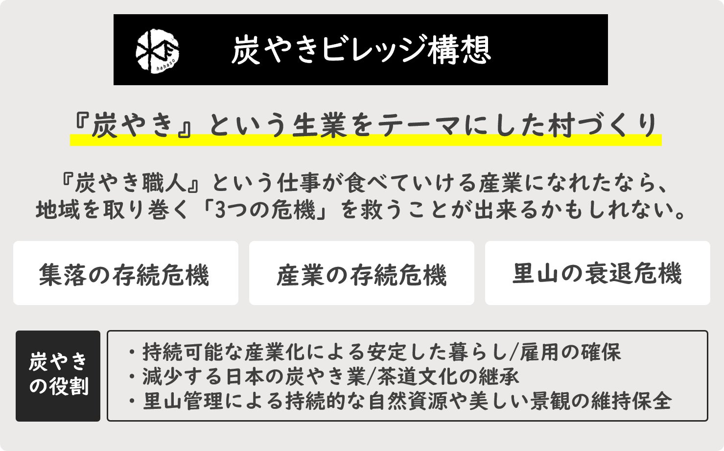 炭やきビレッジ構想は、それらの危機に対して、もう一度、”炭やき”という生業を、この地で”食べていける産業”として根付かせることが出来れば、人が住み、里山を守る人が増え、豊かな自然や文化を守りつなげることが出来るのではないか?という仮説に基づいた挑戦です。