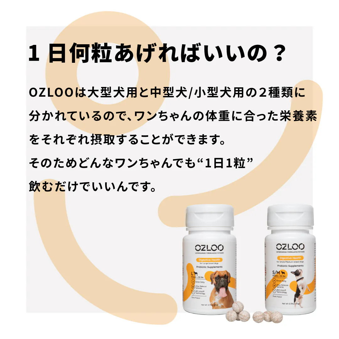 愛犬の体重に合ったサイズのOZLOOを1日1粒を与えてください。