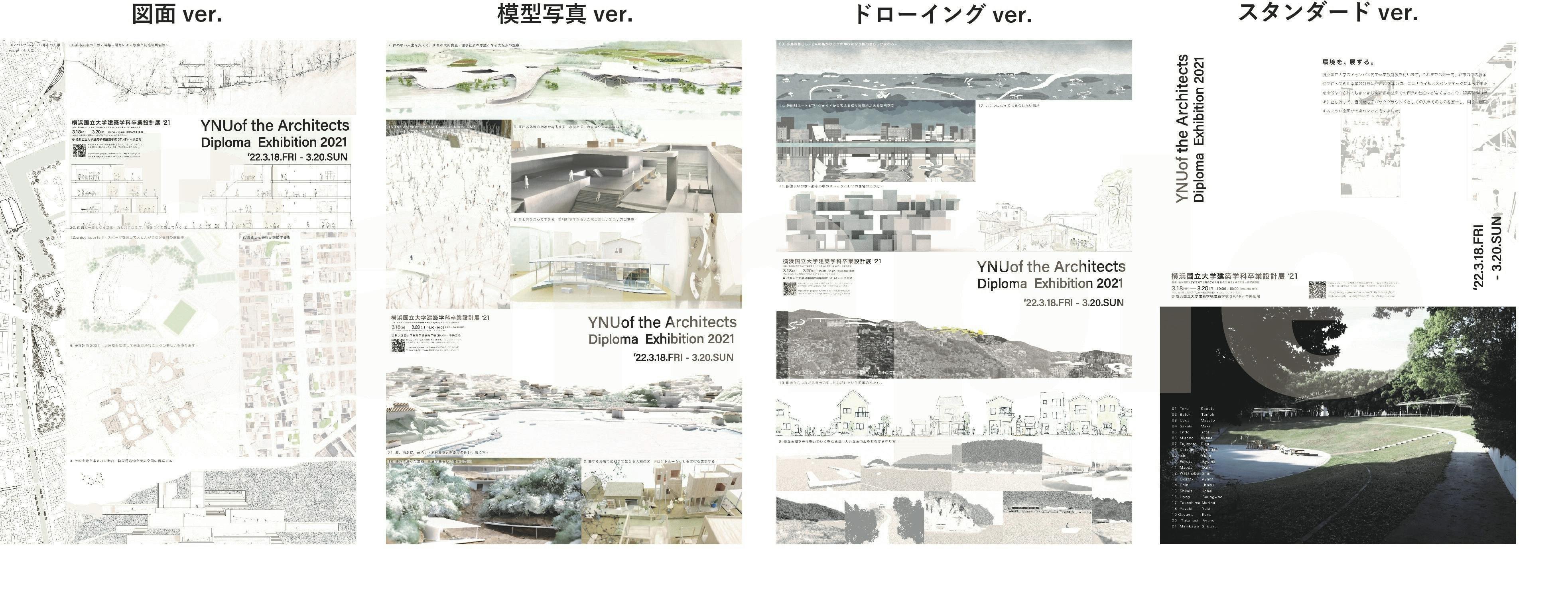 今回の卒業設計展 ʻ21 のポスターです。テーマごとにデザインを変化させ、学生作品の図面やドローイングが含まれたものになります。サイズは A2 でご用意しておりますが、A3 への変更も承ります。