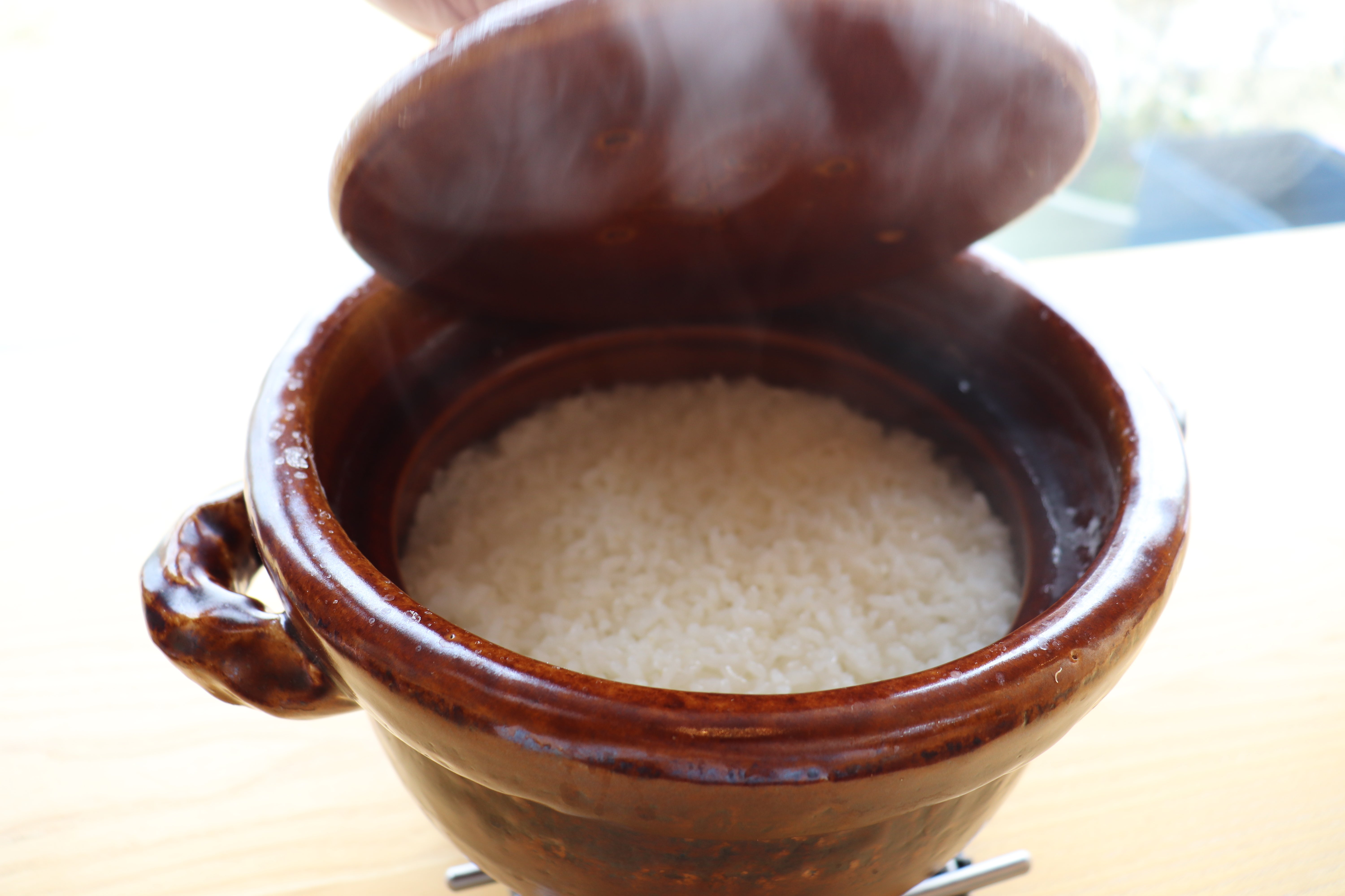 ①土鍋で炊き上げる服部農園(愛知県大口町)の特別栽培米