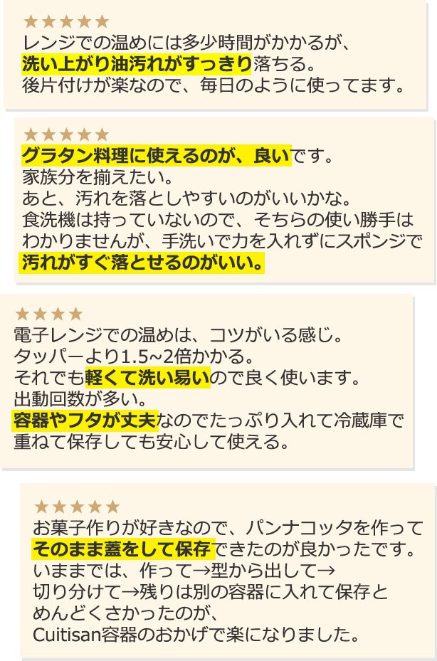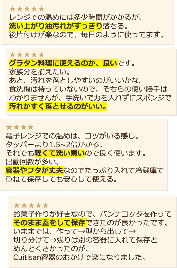 さらにCuitisanは丈夫で軽い、そしてレンジ使用においては食材によって容器が傷むなどもほとんどなく、加熱調理ができるのも魅力の一つと感じます。』