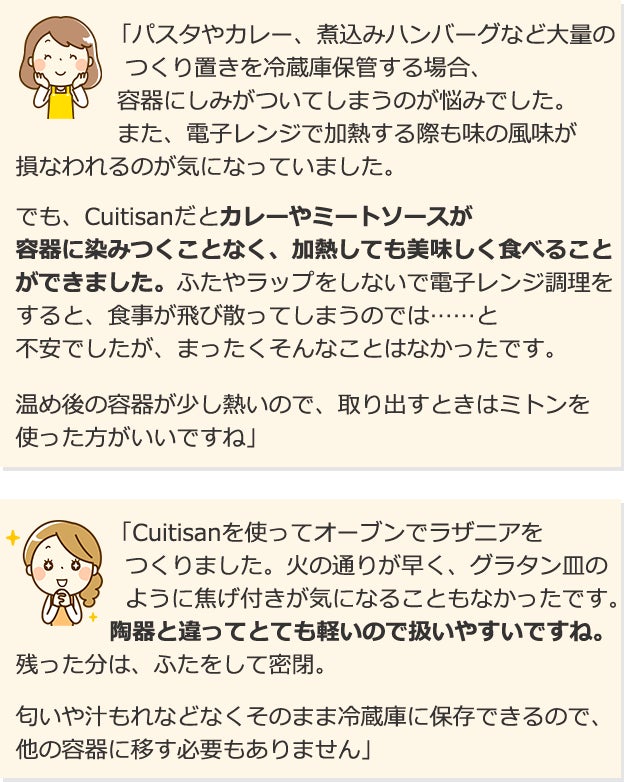 『Cuitisanを使用してまず感激したのは、容器1つで実現する用途の広さ。料理で使用する容器には、他にもガラス、ホーロー、プラスチックなど様々あり、それぞれにメリットがあります。Cuitisanの場合は、レンジ、オーブン、トースター、そして蓋もついているので保存容器、お弁当箱としても使え、まさに一石五鳥⁈