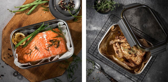 ①ステンレス容器なので、材料を保存しながら味付けでき、電子レンジやオーブンで魚料理、肉料理、シチュー、カレー、パスタ等さまざまな調理が可能です。
