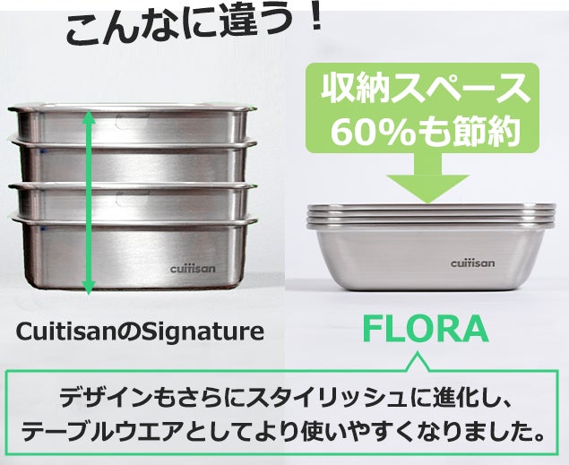今回のFLORAであれば、完全に重なるスタッキングができ、キッチンの収納スペースを大幅に削減できるようになります。Cuitisanの良さ(レンジで使えて軽くて丈夫、衛生的)を持ったまま、家族の人数分、同じサイズでそろえても省スペースにできるCuitisan FLORAをぜひ、日本に広めたいと思いこのプロジェクトをスタートしようと思いました.