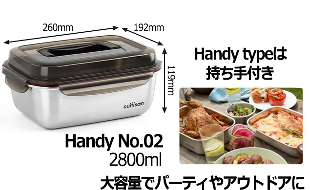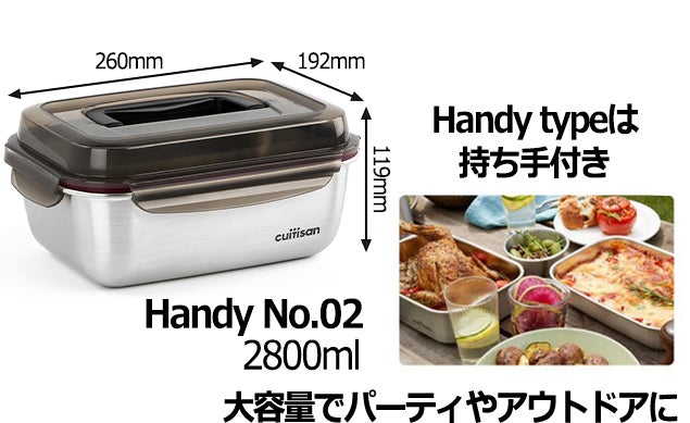 ⑦ハンディータイプは大容量で、保存容器では珍しい取っ手付きです。片手で持ち運び出来て、ピクニック、キャンプなどのアウトドア、持ち寄りのパーティーなどに大活躍!!