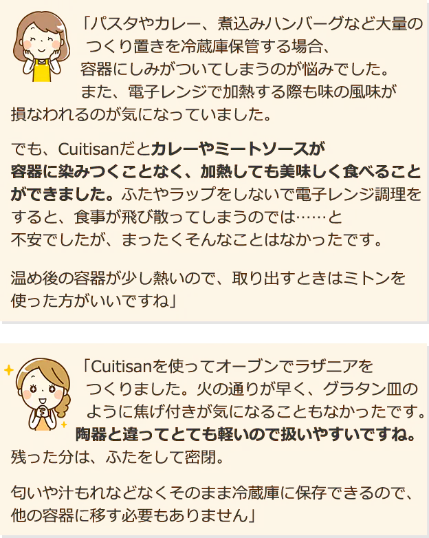 Cuitisanは、冷凍・冷蔵保存から電子レンジ、オーブン調理まで様々なシーンで使用できるからこそ、毎日 便利にお使いいただけます。