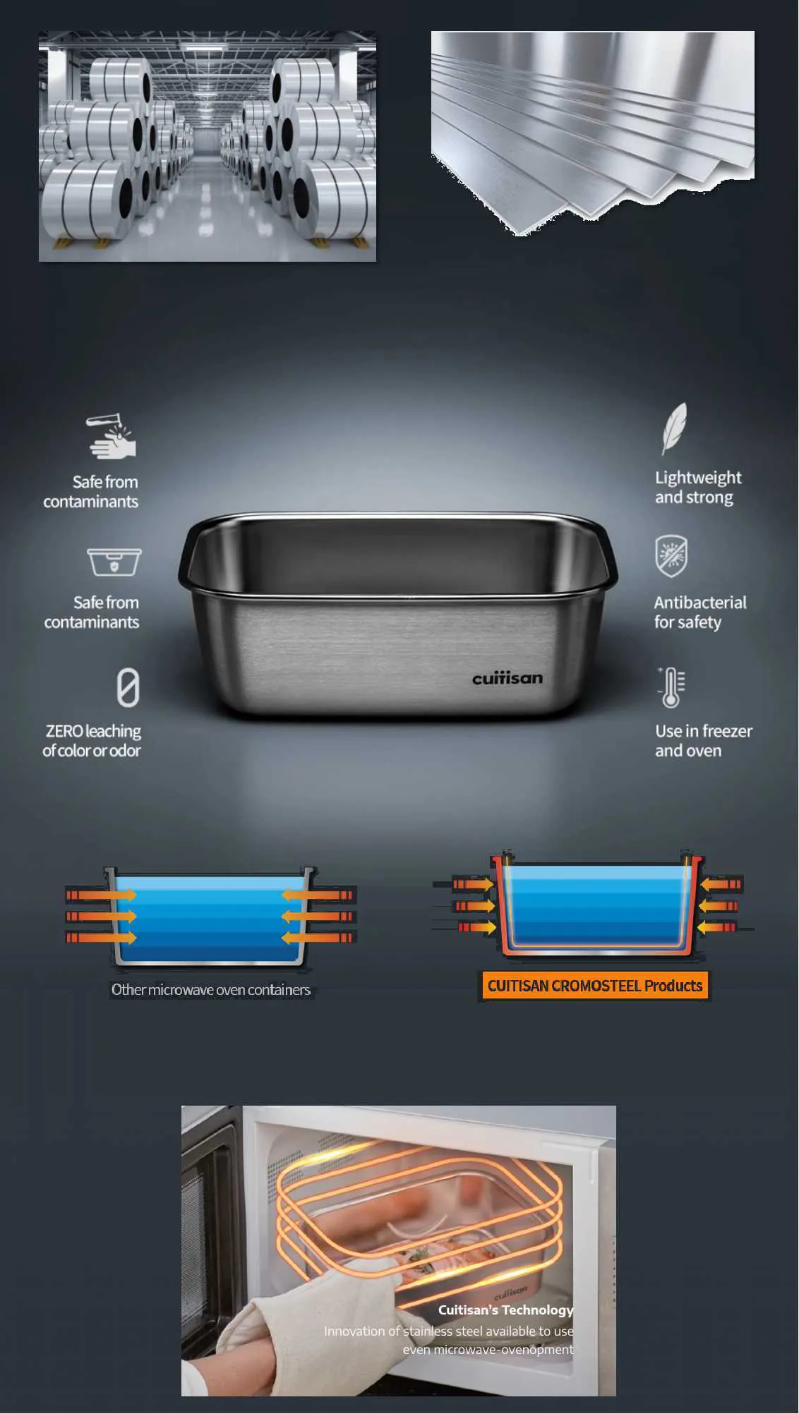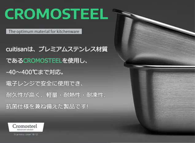 従来のステンレス製品のほとんどは、電子レンジで使用できませんが、Cuitisanでは長年開発をつづけてきた特別なステンレスCRMOSTEELを採用し、電子レンジ使用を実現しました。