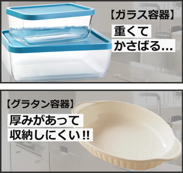 たまにしか使わないグラタン容器って厚みがあって形も様々で収納が大変!