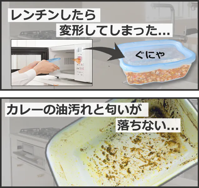 ・カレーを保存しておいたプラスチック容器を洗ったけど、カレーの色や油、匂いが取れない。