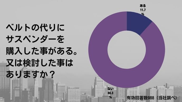 しかし当社のアンケートでもサスペンダーの購入を検討したことがある男性はわずか11.7%。全体の1割程度しかありません。
