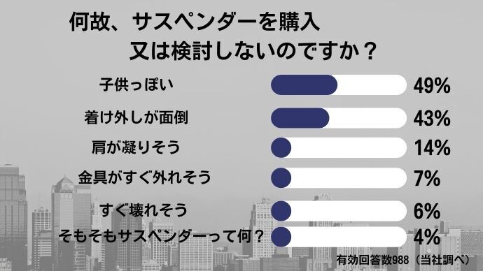 サスペンダーを検討しない理由について当社が行ったアンケートでも、「子供っぽい」「取り外しが面倒」という理由がほぼ半々。サスペンダーに対してネガティブな印象を持っているのが分かります。