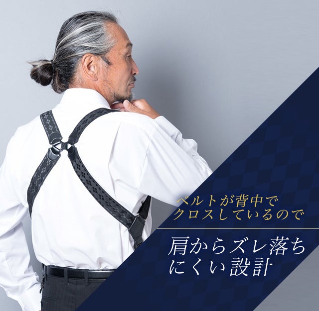 さらに伸縮性があるためベルトが肩からズレにくく、しっかりとズボンをキープします。