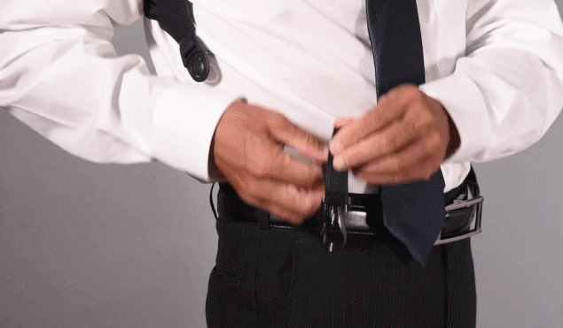 バックルから抜いて緩めなければならないベルトと異なり、素早くズボンが脱げ、しかもベルトは肩にぶら下がったままなので、ベルトが地面に触れることもありません。