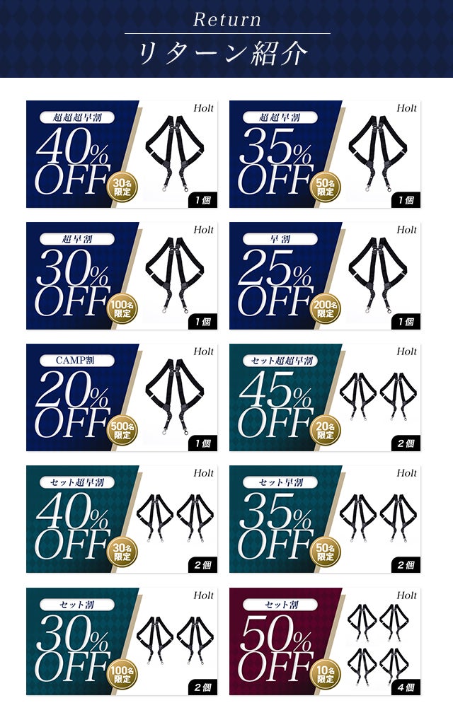 2022/12/20 21:43LINE登録キャンペーン!!ご好評いただいた、VARIORAサスペンダー【Holt】が、Ver2として更に使いやすく進化しました!その【Holt】Ver2の最新情報をLINE公式アカウントにて配信いたします!LINE登録はこちらから もっと見るリターン発送完了のお知らせ