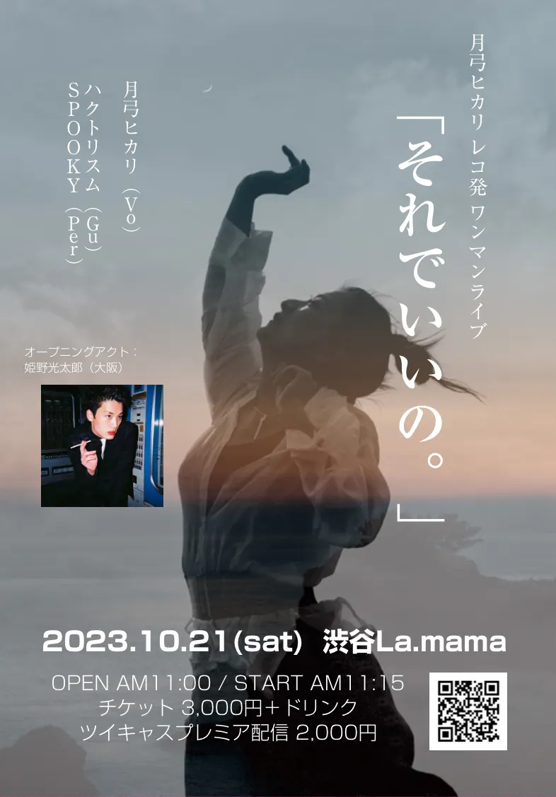 2023/10/02 12:44発送作業以降、なかなか更新できず失礼致しましたm(__)m遅ればせながら、お陰様で、8/30に「それでいいの。」が全国リリースされました(>_<)!!!クラウドファンディングにご支援頂いた皆様からご感想頂いたり、またリリースしてからお手にして頂いた方々のお声も沢山いただけて、大変嬉しく思います。この様な機会・チャンスを頂いた皆さまには、改めてお礼申し上げます。ありがとうございますm(_ _)mm(_ _)mm(_ _)mさて、そんなアルバム「それでいいの。」ですが、今月21日(土)にレコ発ライブをさせて頂きます!!10/21(土)@渋谷La.mama月弓ヒカリレコ発ワンマンライブ「それでいいの。」OPEN AM11:00 / START AM11:15当日・前売/ 3,000円+1d配信/ 2,000円《オープニングアクト》姫野光太郎(大阪)チケット受付はこちらhttps://tiget.net/events/272118当日は行けないー!なんて方も、配信も当日しますので、是非配信から応援して頂けたら嬉しいです^_^配信チケットはこちらhttps://twitcasting.tv/c:shibuya_lamama/shopcart/259707是非、会場へ遊びにいらしてください(^ ^)♫ もっと見る