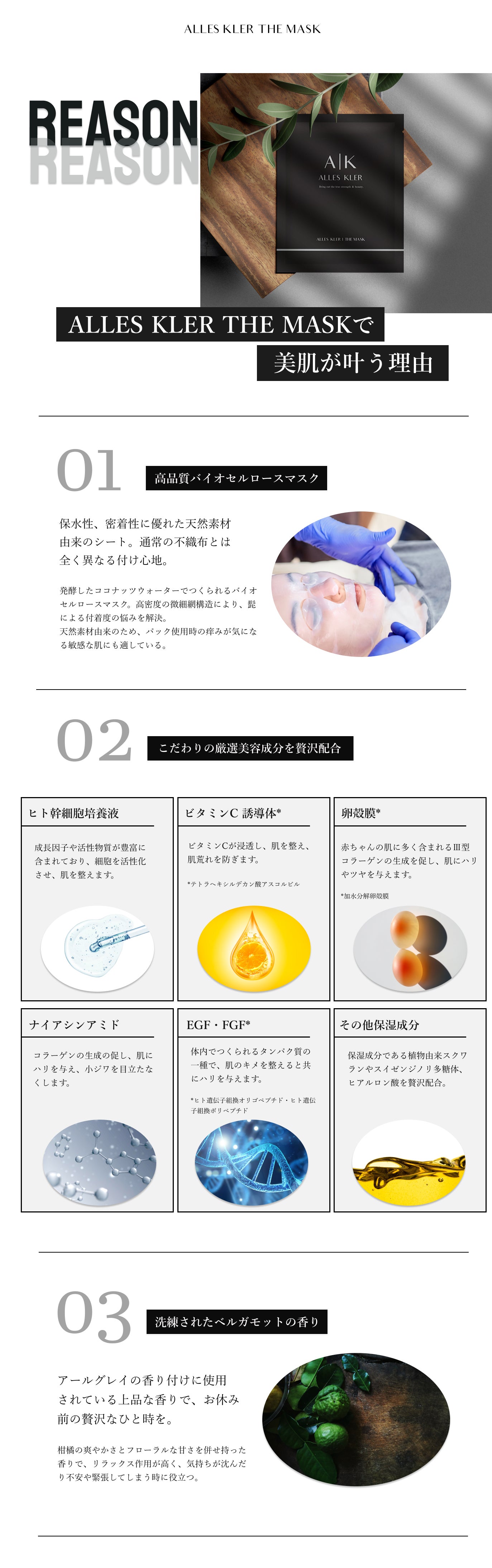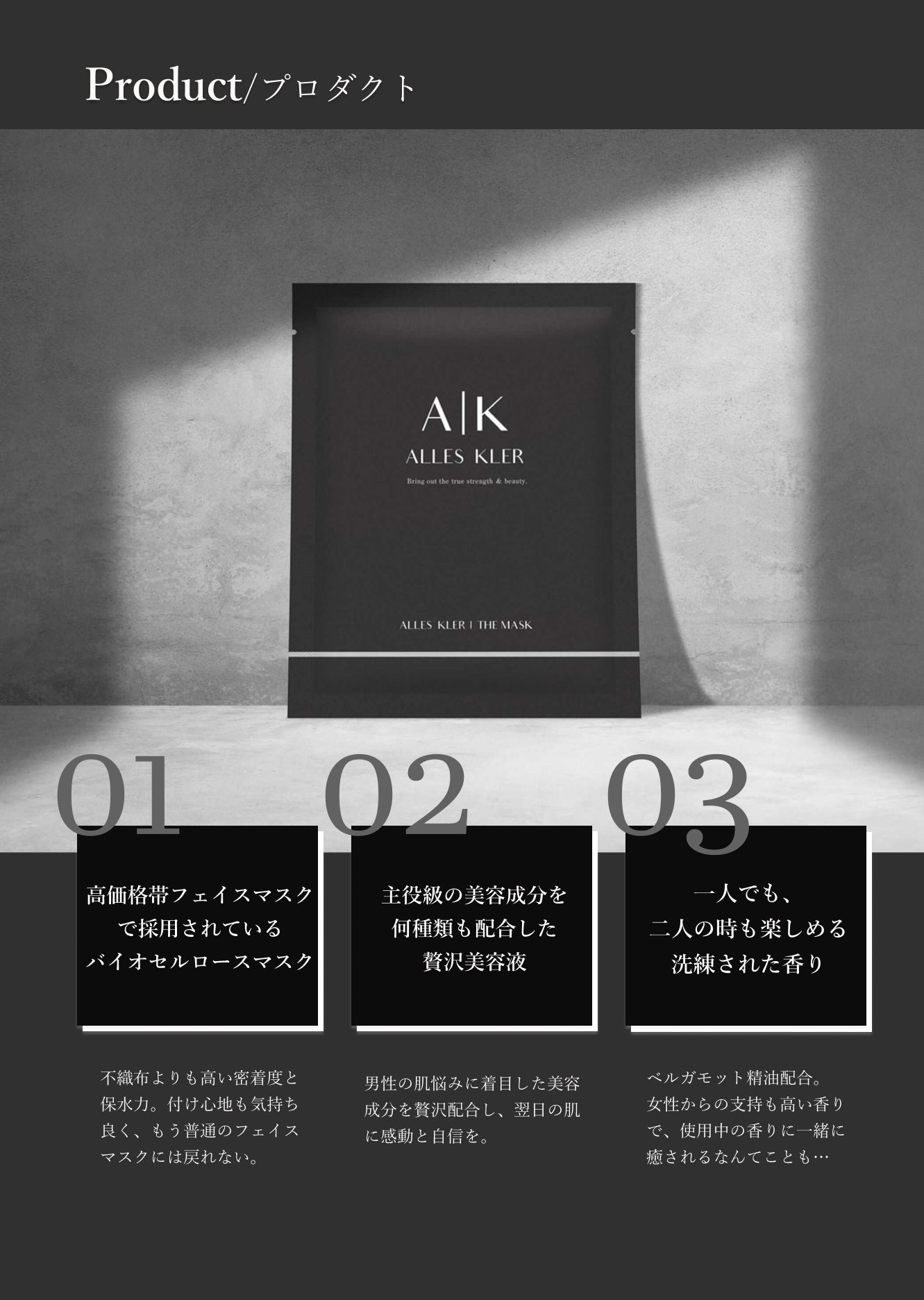 そんな想いを込めて私たちは1st プロダクトとして男性向けフェイスパック「ALLES KLER THE MASK」を皆様に届けます。