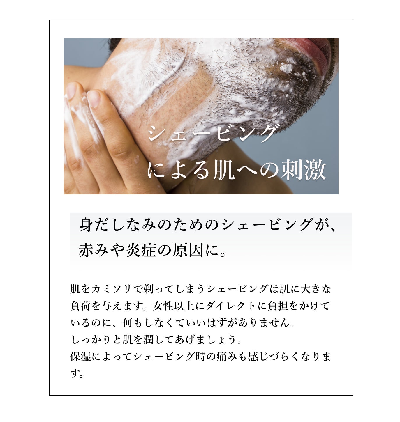 毎日の髭剃りで肌が痛むことを悩んでいました。一応お風呂上りにスキンケアはしていたのですが、何を試してもこれと言っていい効果が見られず、諦めを感じていたところでした。この商品を使用した翌朝には髭剃りの痛みがなく、今まで十分な保湿ができていなかったんだと気づきました。毎日でも使いたいです。