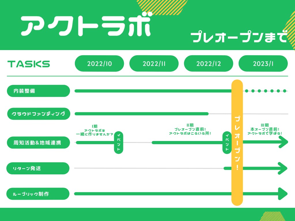 また、地域住民やビジネス利用者に「コワーキングスペース」として開放することも視野に入れています。子どもへの学習支援だけではなく、地域交流、活性化の場所としての「アクトラボ」です。