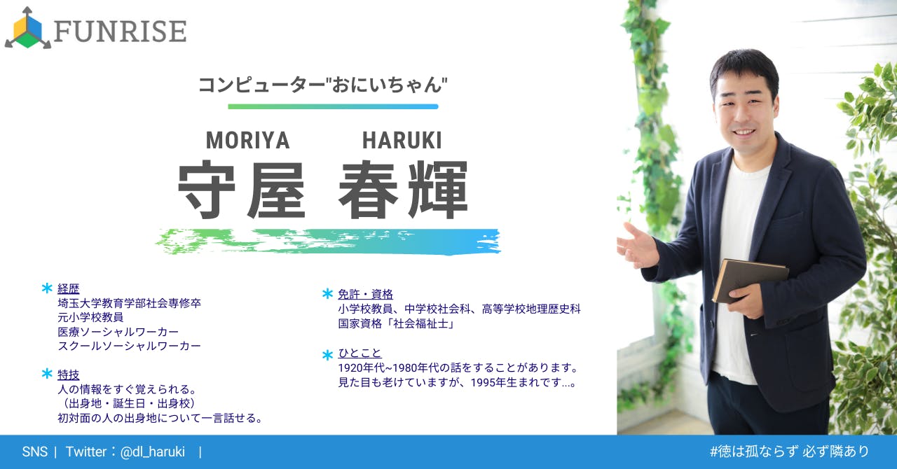 こんにちは、私は埼玉県を中心に教育に関する活動をしている非営利団体「FUNRISE」の代表をしています守屋春輝です。