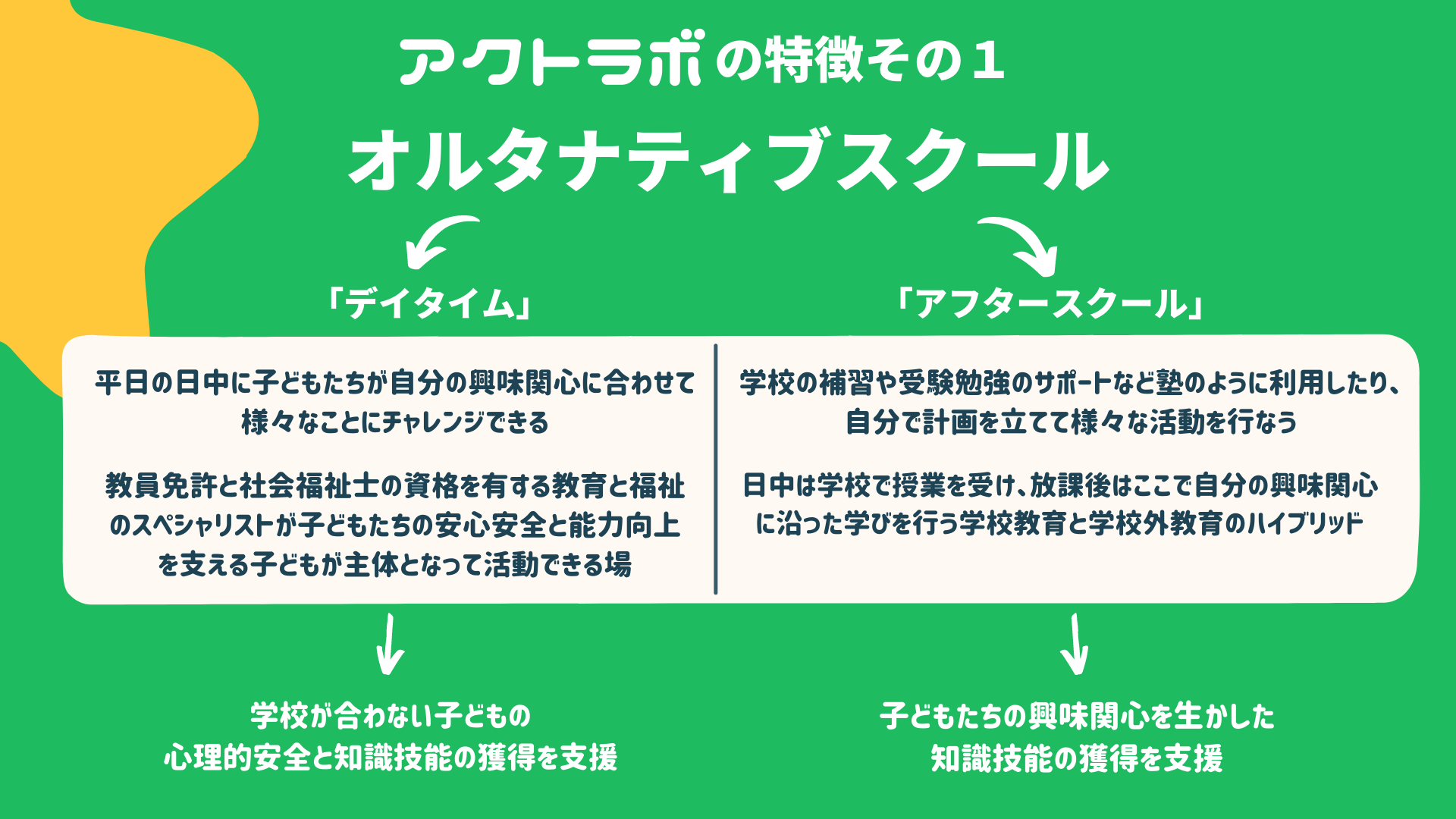 オルタナティブスクール・コワーキングスペース「アクトラボ」は他のオルタナティブスクール(フリースクール)や子どもの居場所、塾、さらには学校とどういった点で異なるのか...