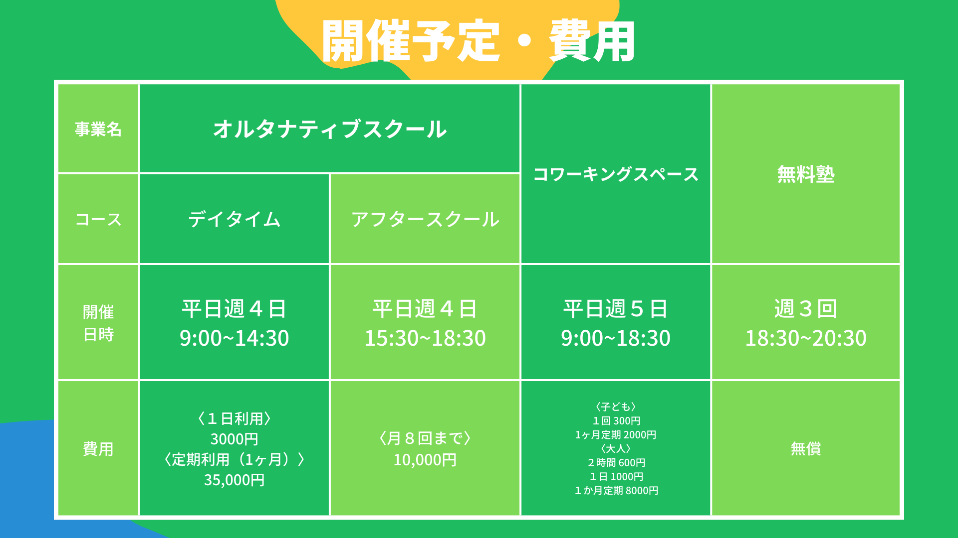 「オルタナティブスクール」とはこれらの学校に該当しない、第3の教育の場として「自身が主体的に学ぶことができる場所」のことを指します。やや身近なところでは『フリースクール』もオルタナティブスクールです。私たちが目指す「オルタナティブスクール」も学校でも家でもない第3の場所として子どもの気持ちに寄り添った場所の運営をしていきたいと考えています。