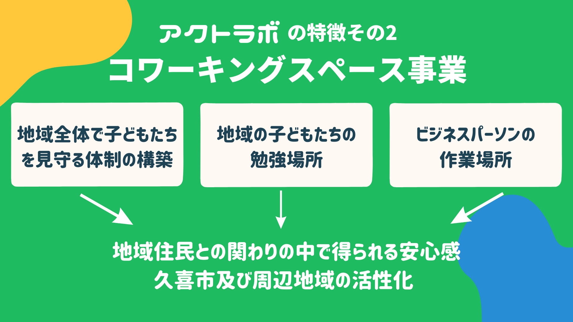 また、地域住民やビジネス利用者に「コワーキングスペース」として開放することも視野に入れています。子どもへの学習支援だけではなく、地域交流、活性化の場所としての「アクトラボ」です。