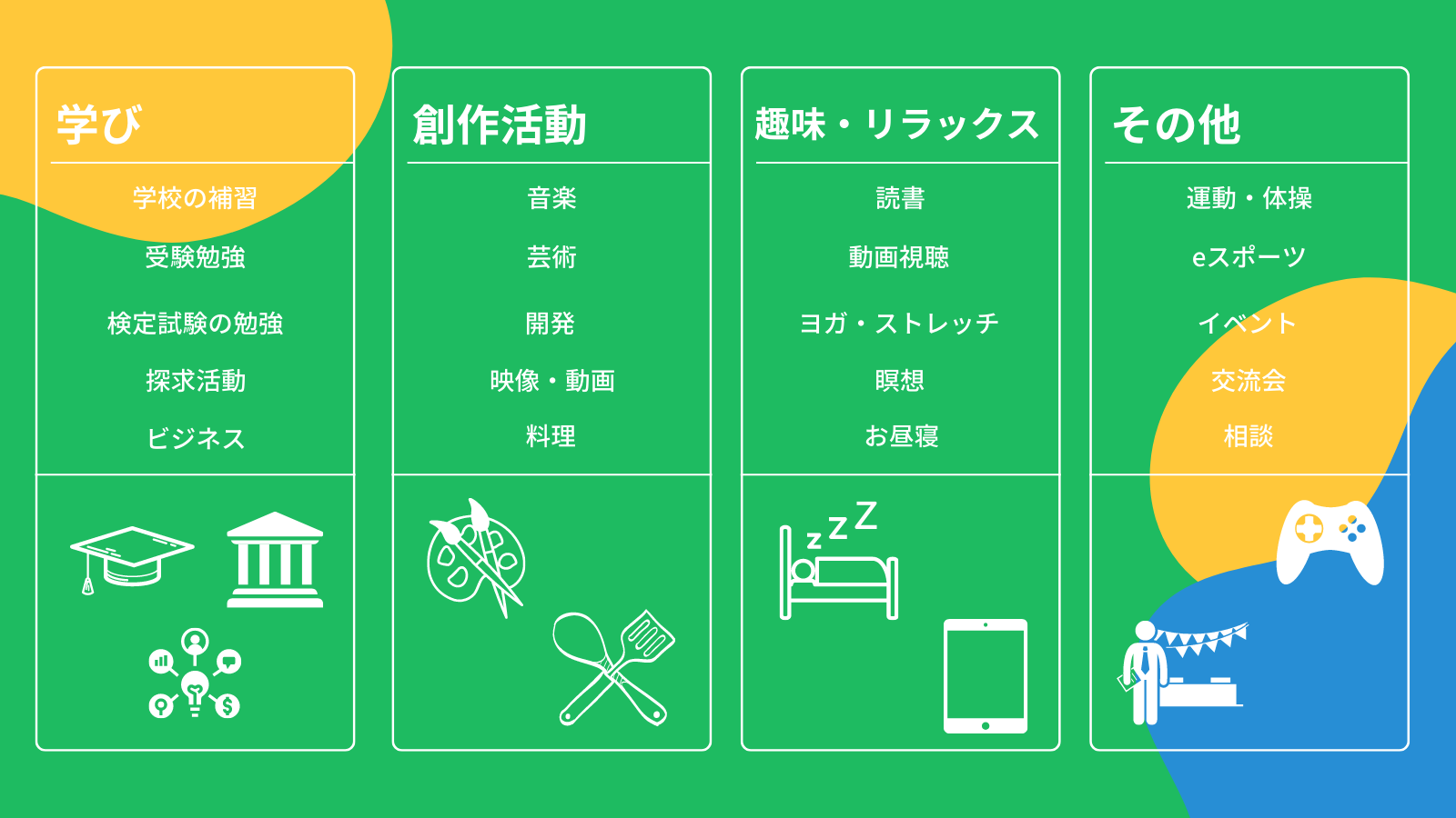 学校の宿題や受験勉強などの塾ように利用したり、自分で計画を立てて様々な活動を行ったりすることができます。「オルタナティブスクール」を利用する子どもたちと同様に施設のハード、ソフトを利用できます。