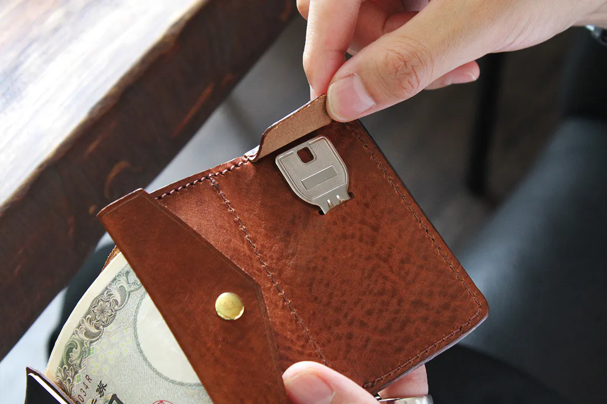 コンパクトウォレットのユーザー様は鍵も小銭入れ入れても持ち運んでいた事から余ったスペースに鍵ポケットをつけさせて頂きました。