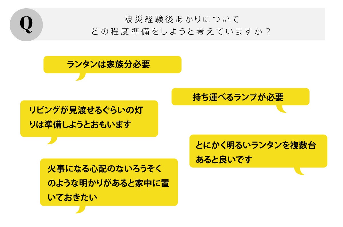 多くの人がランタンの様なあかりが家族分必要だと答えました。この事からも日常と避難場所両方で使用できるあかりの防災グッズが必要とされている事がわかります。