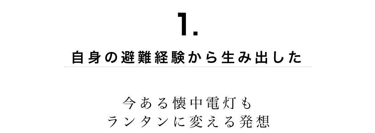 自分がいざ避難する、というときに懐中電灯はありったけバッグに詰めましたが、ランタンはかさばり避難所に持って行くことを諦めました。避難所ではやはりランタンのあかりは必要だと感じたものの、自分を含め携帯してきたあかりは懐中電灯のみ、という人がほとんどでした。この避難経験を元に軽くてかさばらないランタンを作るにあたって、「持ってきた防災グッズで十分なのか」「ひとつしかないものが電池切れや故障で使えなくなるとどうしよう」、と不安な夜を過ごした事を思い出し、複数備えているであろう懐中電灯を生かせる商品である事が重要だと考えました。サイズの合うLED懐中電灯ならなんでもランタンに変えられるので既に常備している懐中電灯も、これから買う懐中電灯も様々な状況で使用できます。※入れられる市販のLED懐中電灯サイズはH160x30Φ(手持ち部分)以下になります。