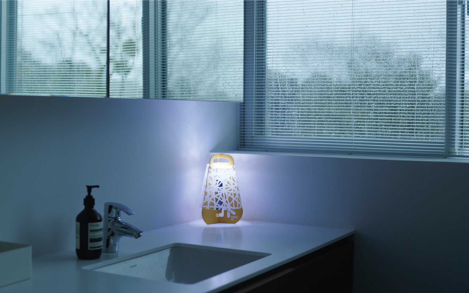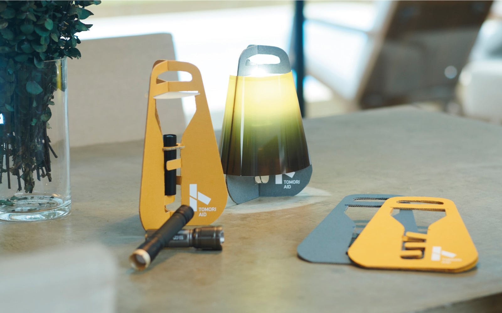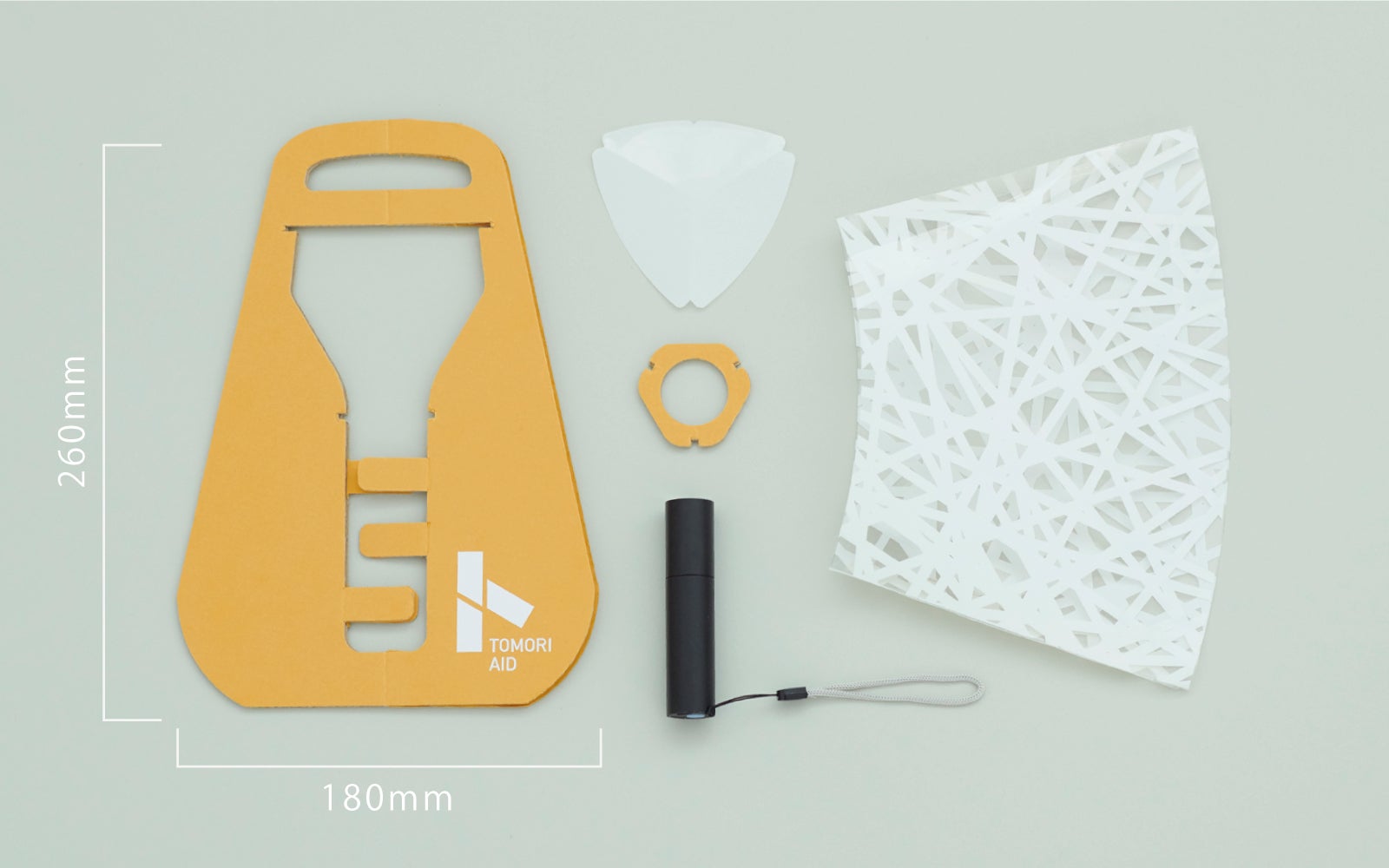 このTOMORI AIDは、 組立てて懐中電灯を中央に入れる事で、懐中電灯の直線的な光をランタンのやわらかな光にできる照明キットです。 年々、日本中全ての人にとって「ひとごと」ではなくなってきている自然災害。デザイナー自らも東日本台風で避難を経験し、デザインのちからで非常時のあかりの不安と問題を解決できないかと考え、このTOMORI AIDを開発しました。