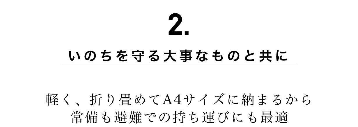 TOMORI AIDは本体を段ボールでつくる事で軽さと曲げの強さを実現しながら、折り畳めばA4サイズに納まる設計によって逃げる時にバッグに入れる必需品の邪魔にならない事を可能にしました。もちろん家でしまっておくにも場所をとりません。