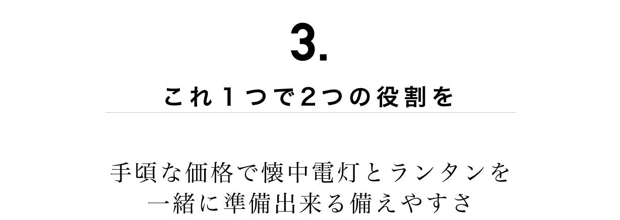 懐中電灯は必ず必要な防災グッズです。TOMORI AIDはUSB充電式LED懐中電灯がセットになっています。まずTOMORI AIDがあれば1セットで懐中電灯とランタン両方として使用できる実用性と備えやすさを目指しました。特許を取ったシンプルな組み立てと固定方法により、誰でも簡単にランタンにする事ができます。