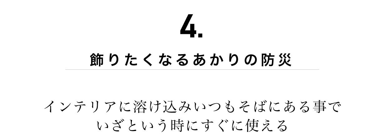 防災グッズは一般的に飾るというより引き出しや見えない所にしまっておく事が多いものです。せっかく備えていても停電してからでは探せない、電池がなくて使えないといった事が起こり得ます。いつも飾っておきたくなるデザインで、いざという時のあかりとしてすぐに使用できます。付属の懐中電灯はUSB充電式なので電池の減りや交換を気にせず使用できます。