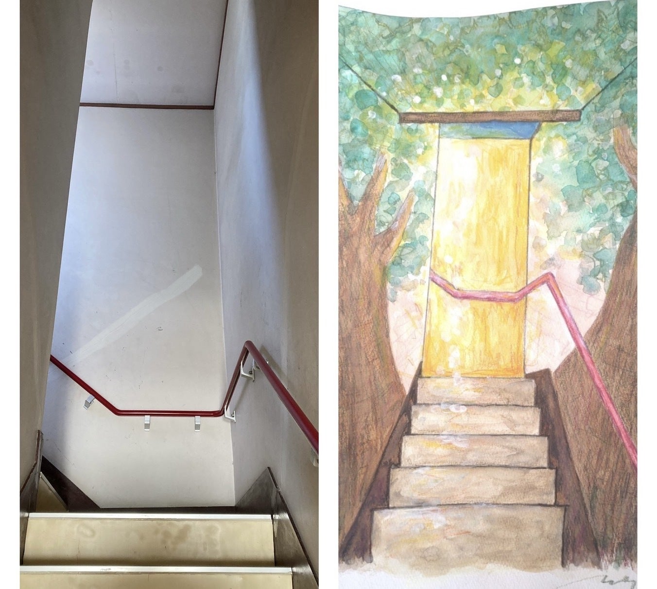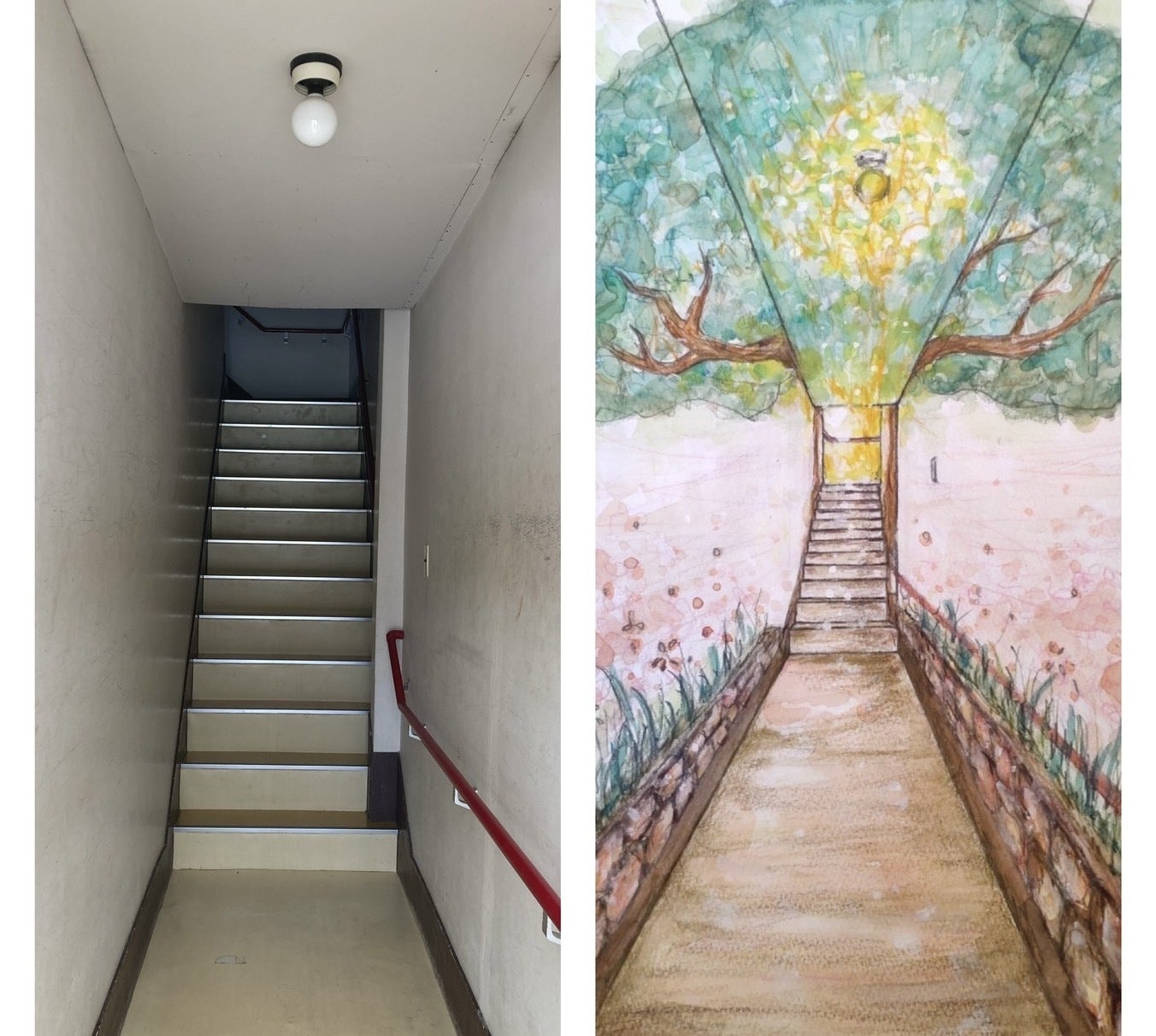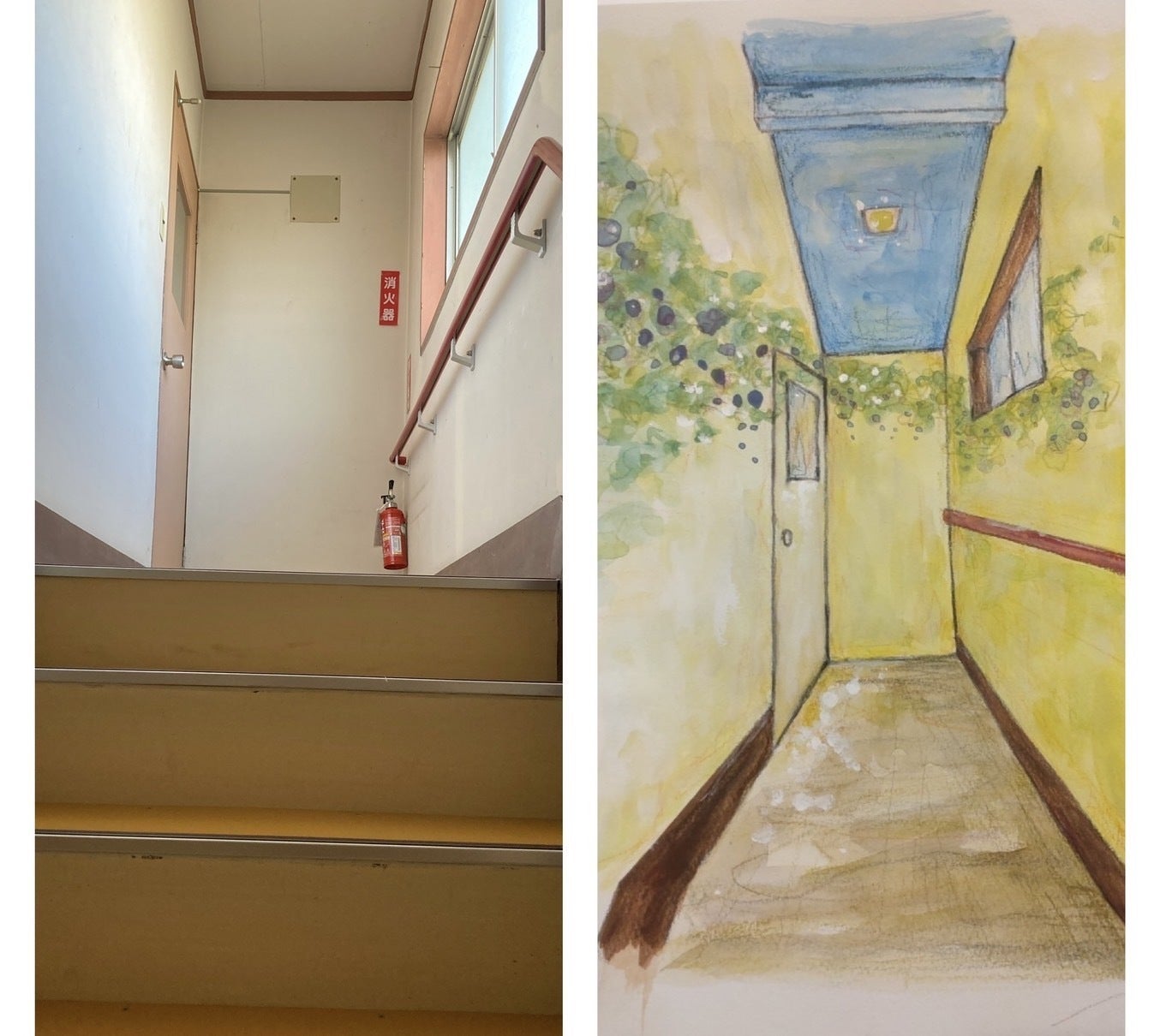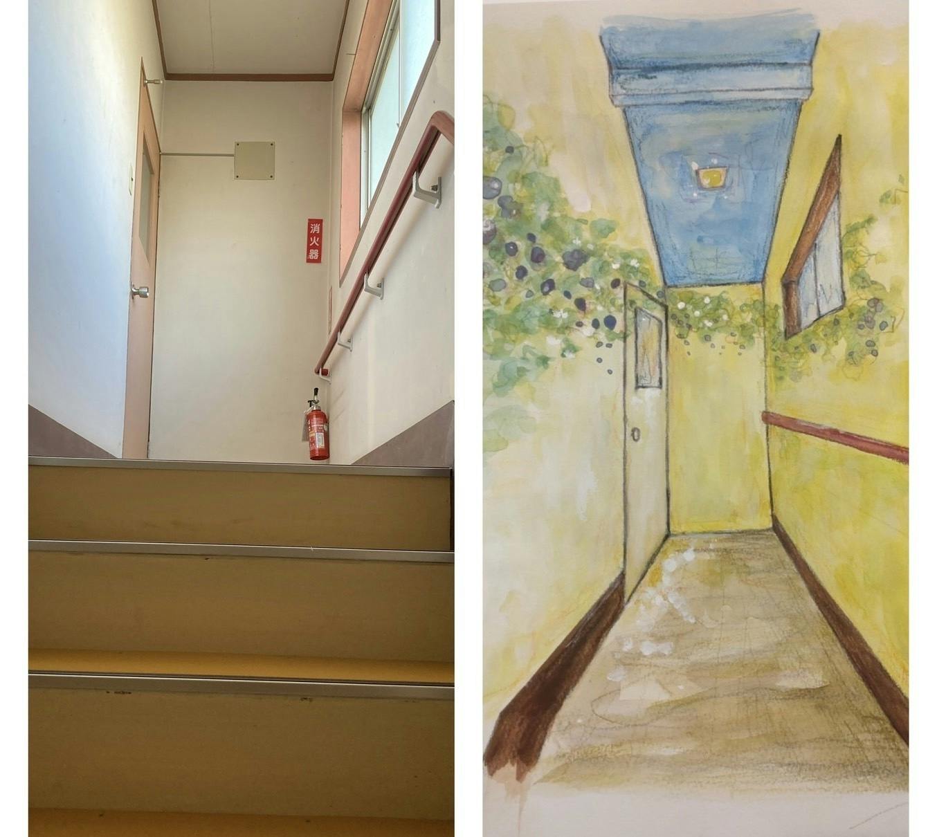 下の画像は、2階までの廊下と階段です。左の写真が現状、右の絵が黒岩さんのスケッチです。自然豊かな空間、不思議の国への入り口です。