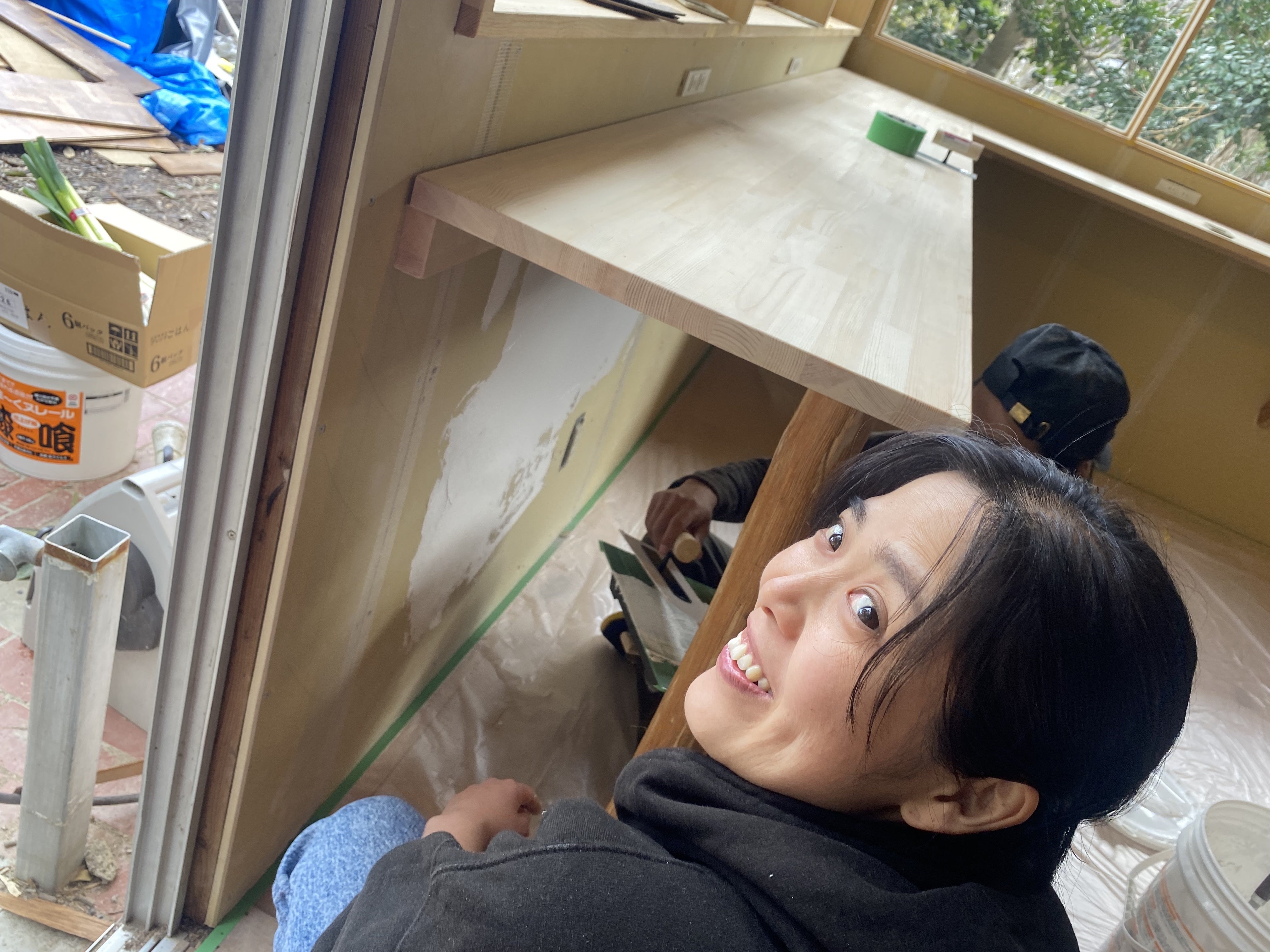 その間にリビングのカウンタースペース(実は昨日の午前中に作り上げておりました!!!)では漆喰を塗ってもらっていました。