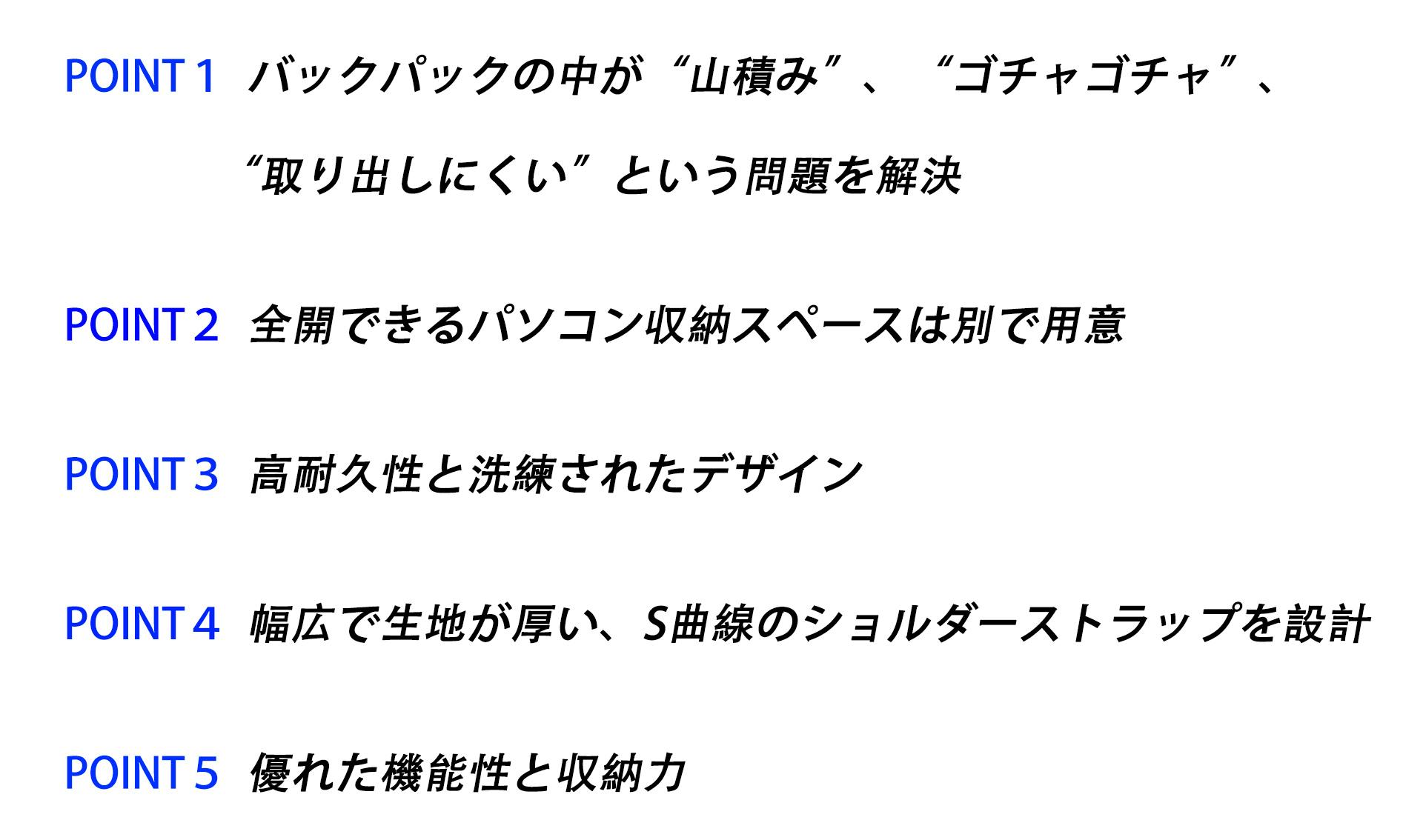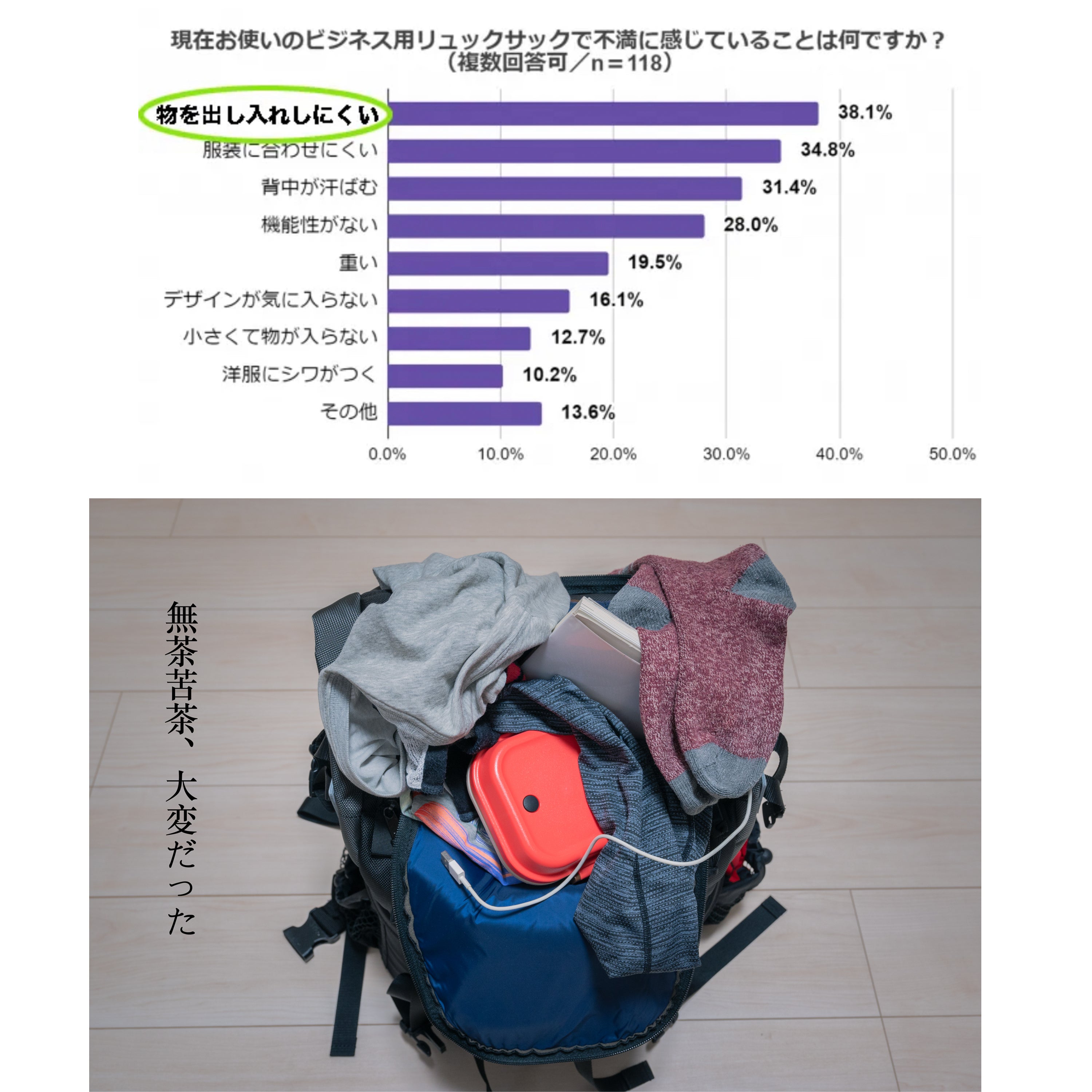 メイン収納が大きく作られたバックパックは大きい荷物を運ぶ時、両手が空いて便利に感じられますが、バックパック特有の悩みとして、中がゴチャゴチャになり、底の方の荷物が探しにくく、細々した物を分類収納できないという問題がありました。
