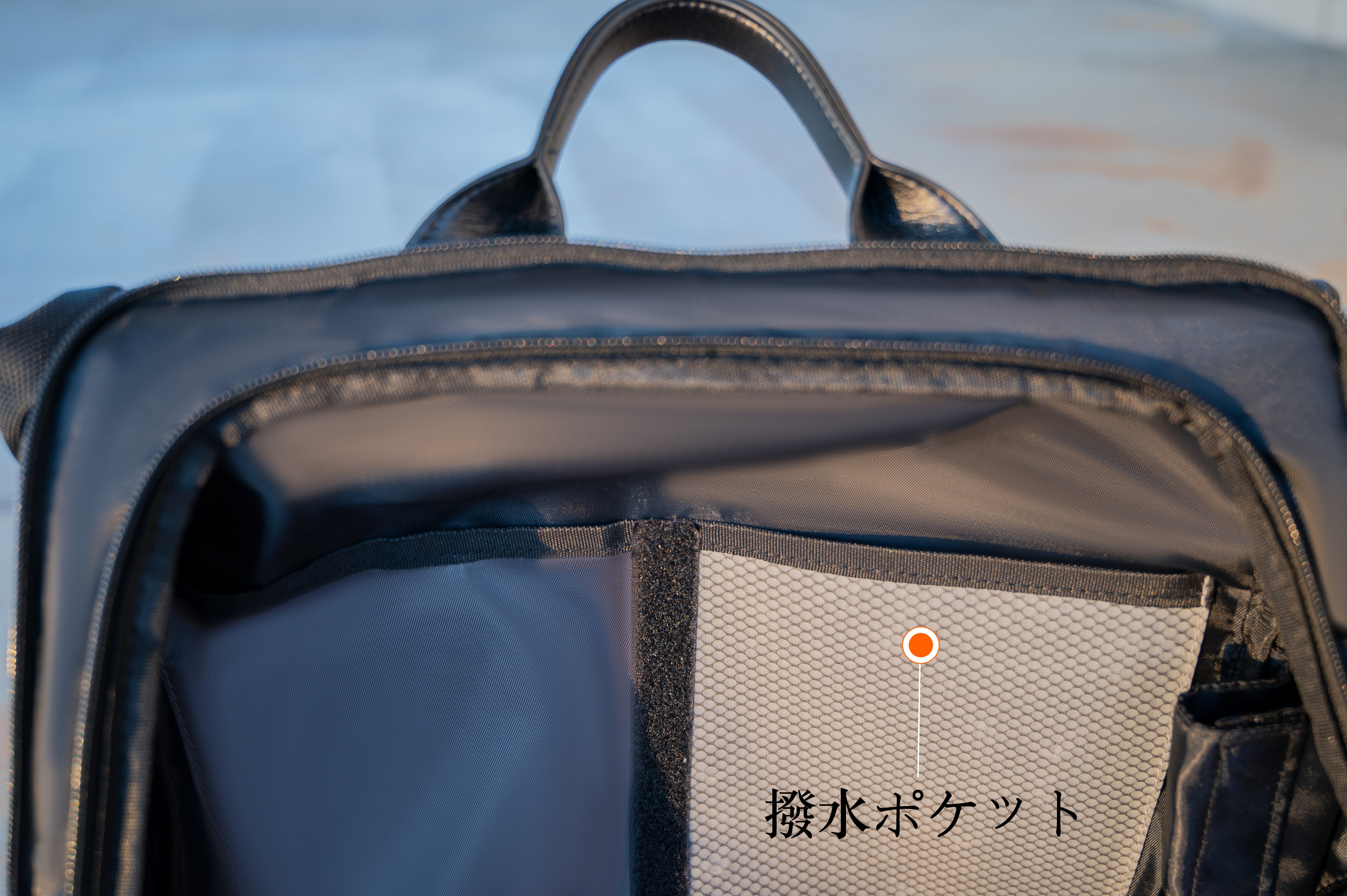 バックパック両側のポケットの片側内部は撥水素材となっており、折り畳み傘を収納することができます。