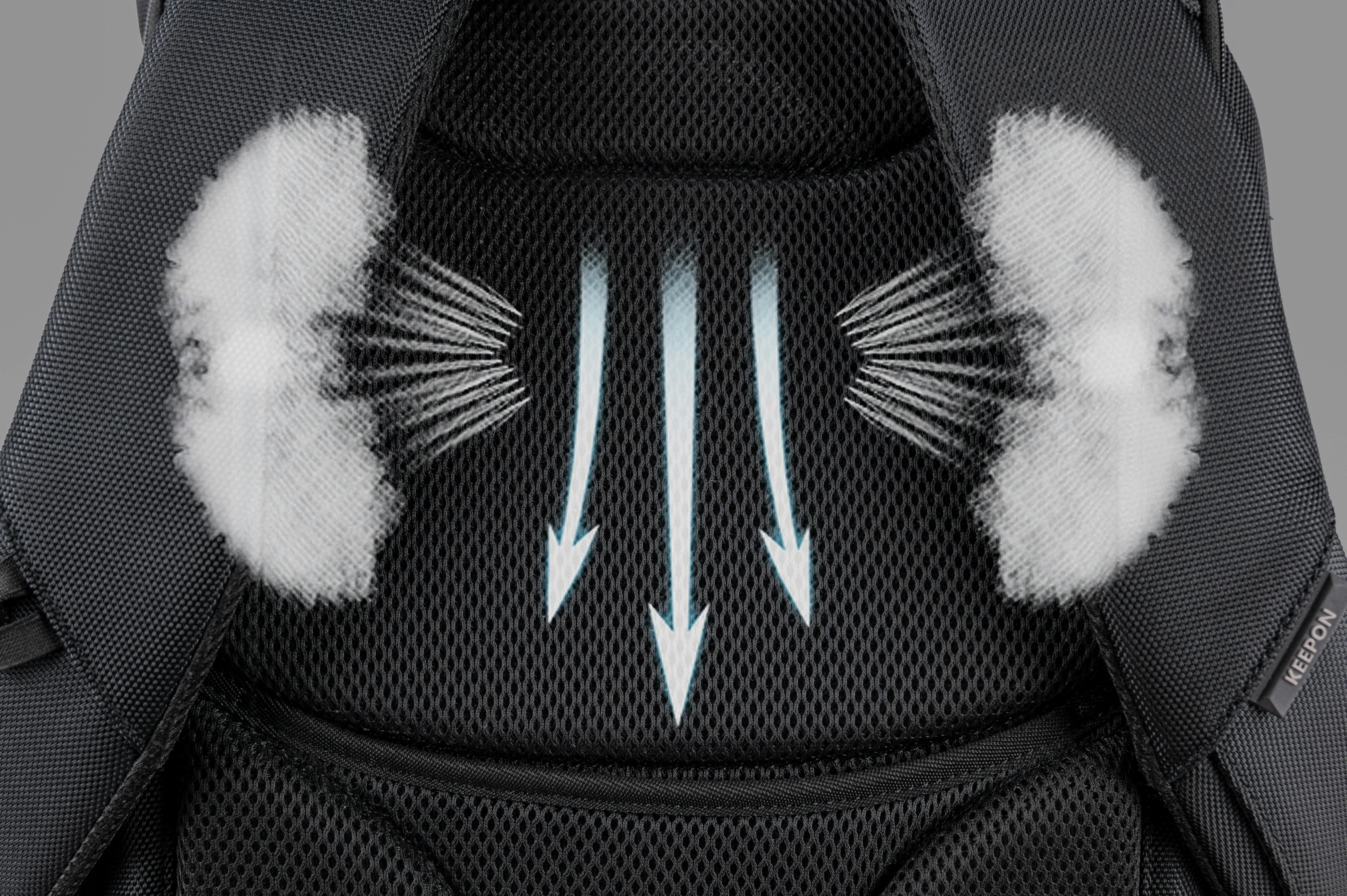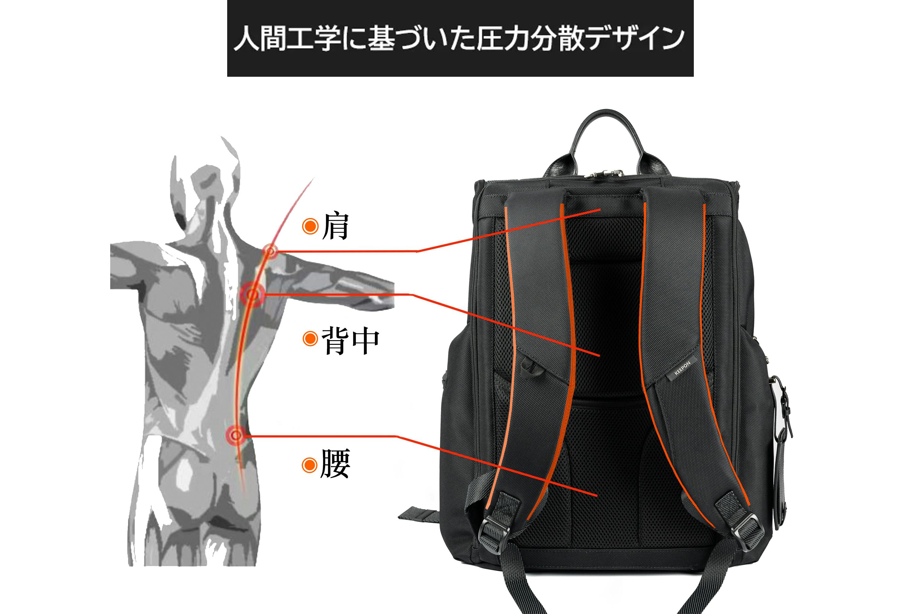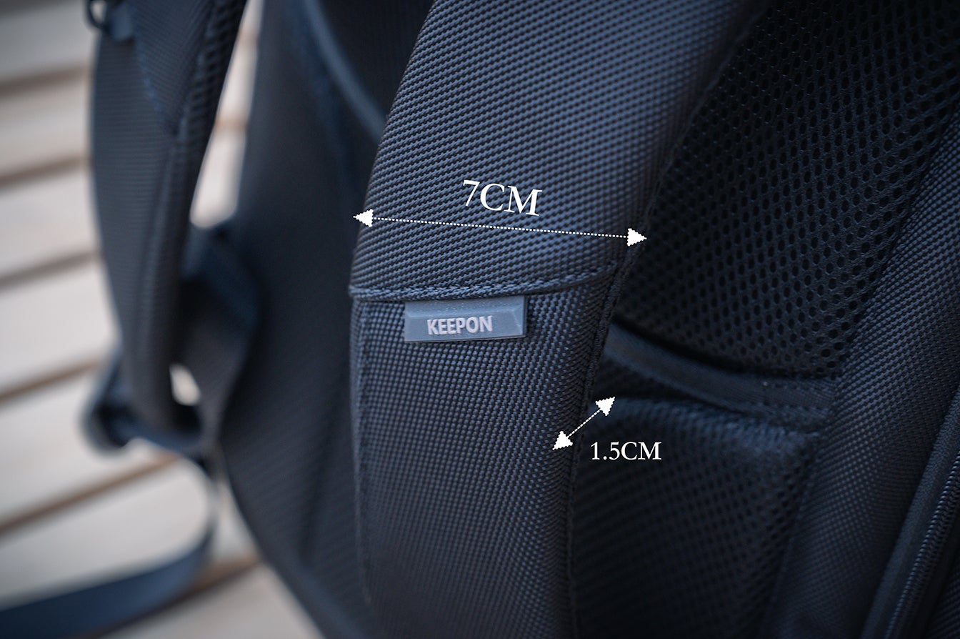 ショルダーストラップ部分は、バックパックの全重量に耐える必要があり、肩への負担を緩和させるため、ストラップ幅を7センチ、厚さを1.5センチに設計しており、普通のバックパックより少し幅広く厚くなっています。