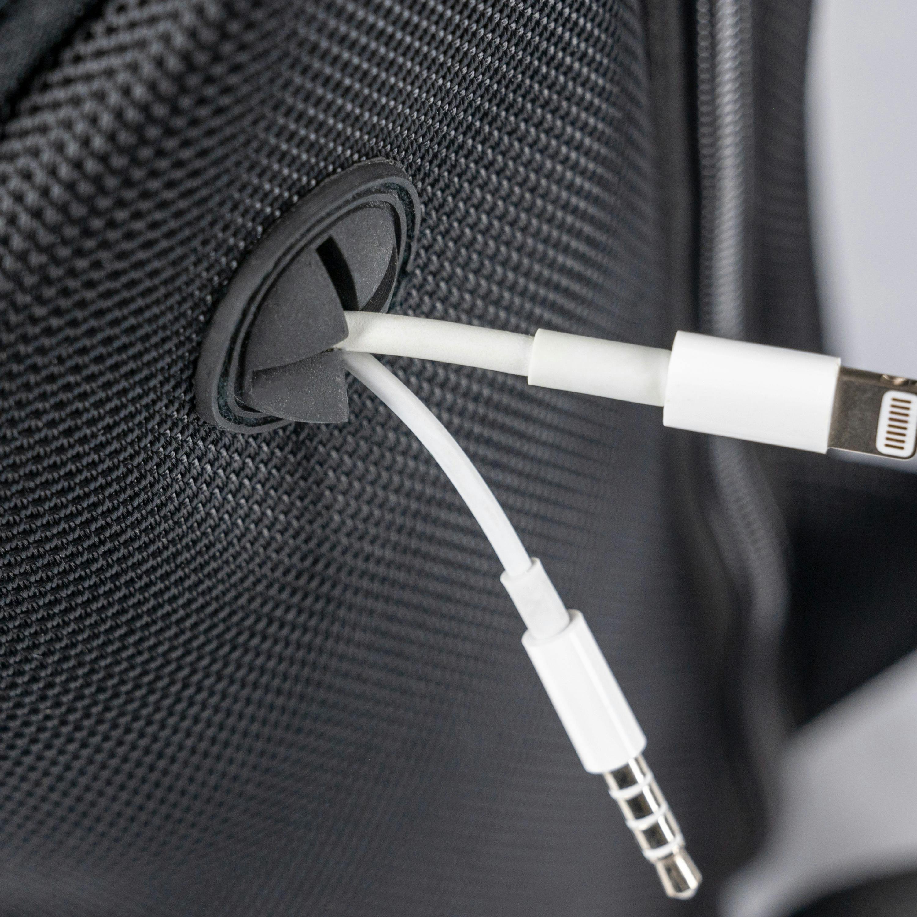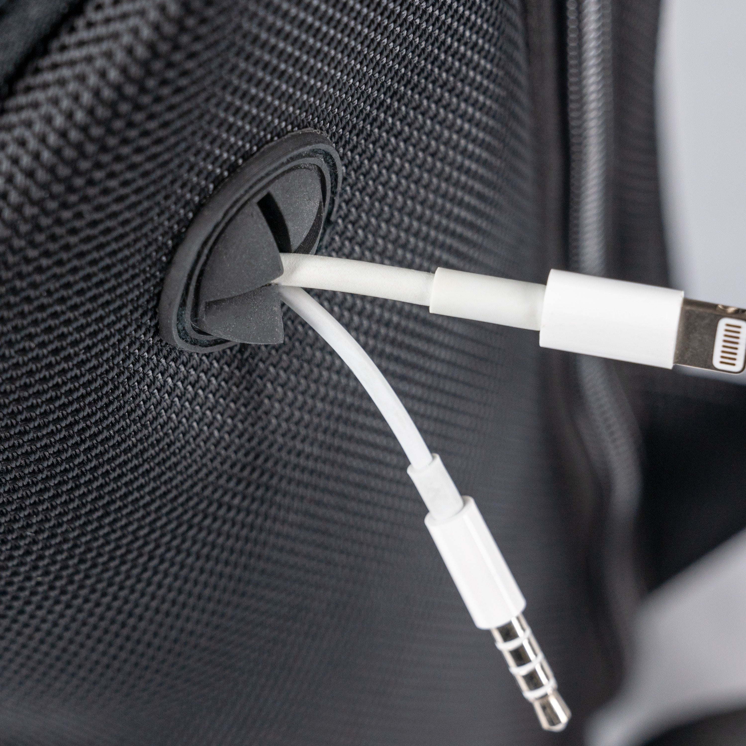 もう一方のポケットには、イヤホンや充電コードが通せるケーブルポートがあり、移動しながら充電や音楽を聴くことができます。