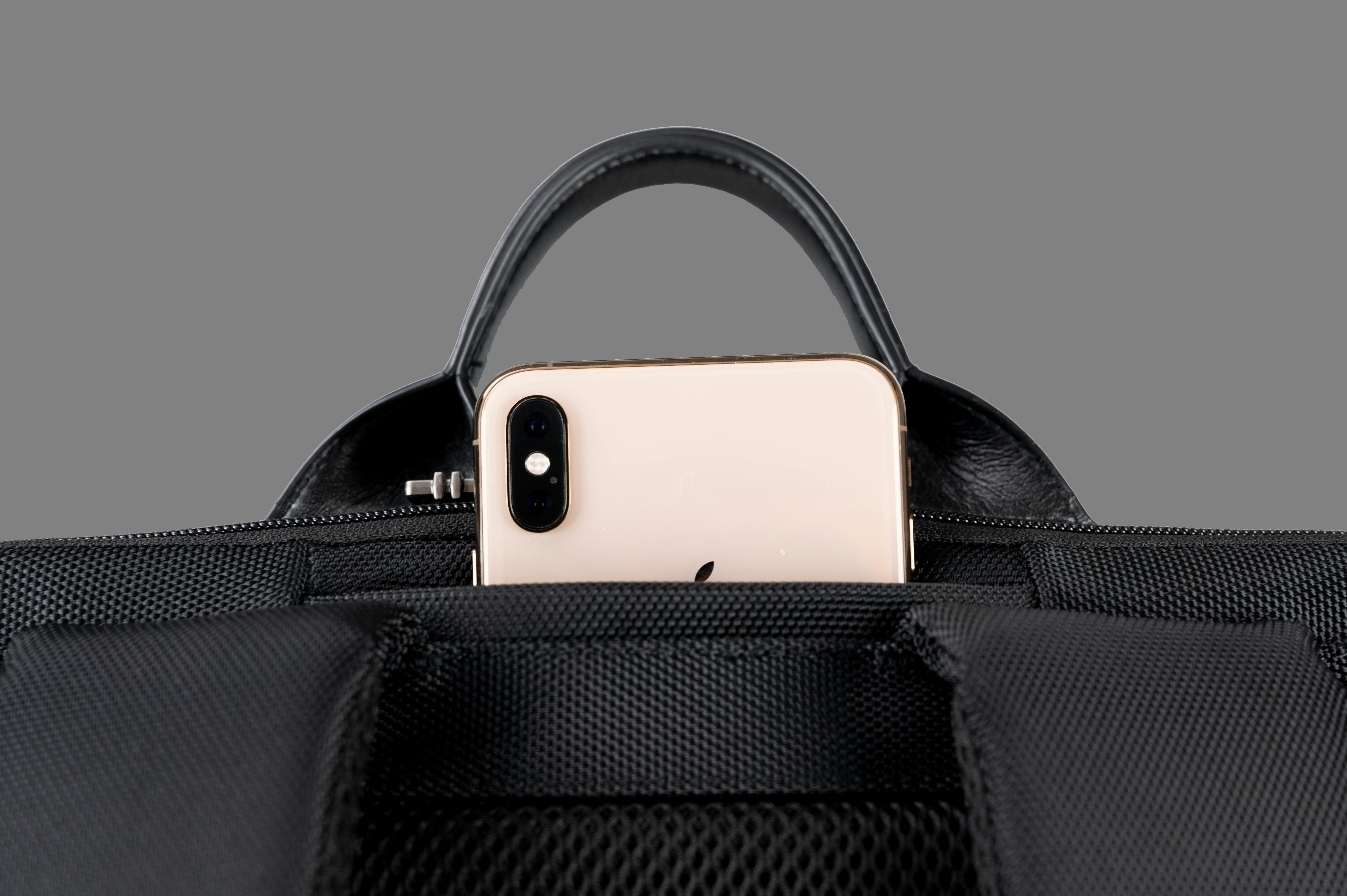 上部の取手部には、携帯電話専用のポケットがあり、携帯を素早く取り出せます。