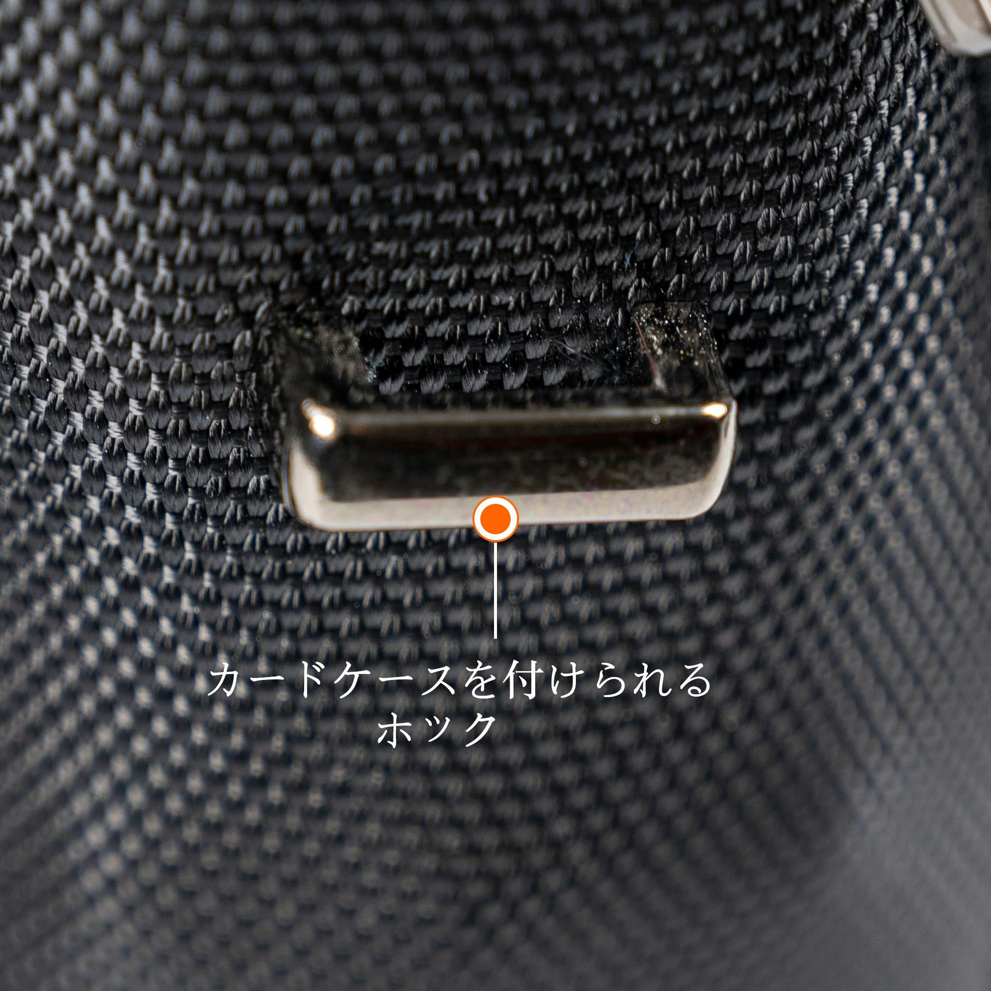 正面下部のポケットには、伸縮可能なキーホルダー、名刺やカード、筆記用具などが収納でき、小物を収納するのにとても便利な機能になっています。