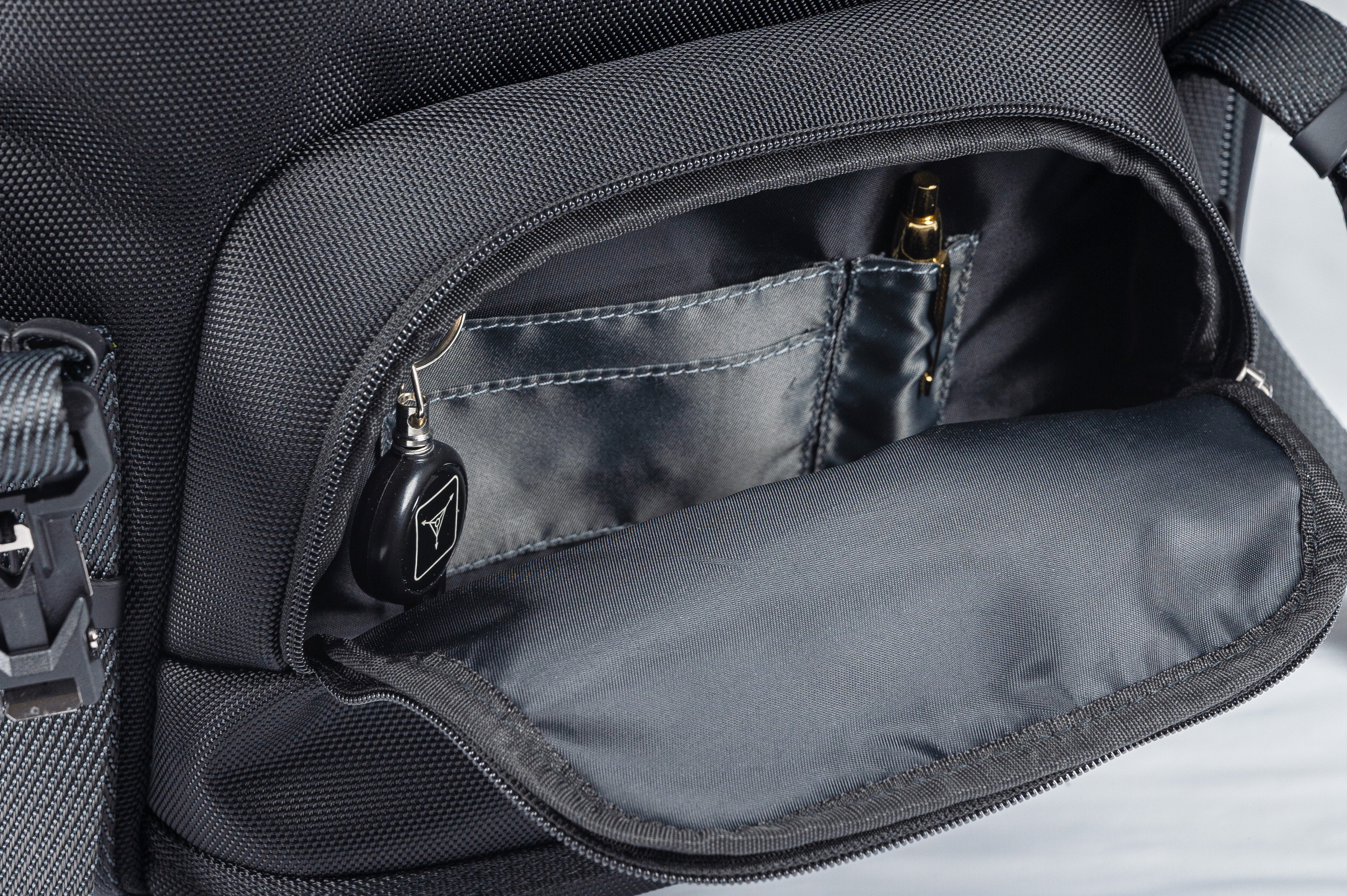 ここはメイン収納とは別で仕切られているので、左右をセパレートして使用している時でも仕切りを気にせずPCを収納可能です。