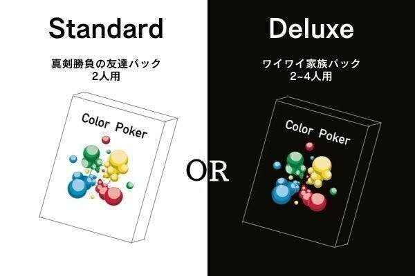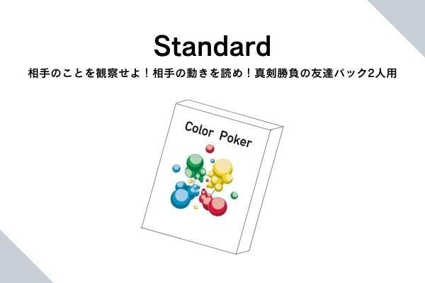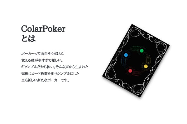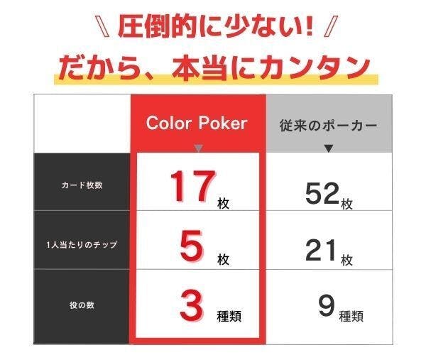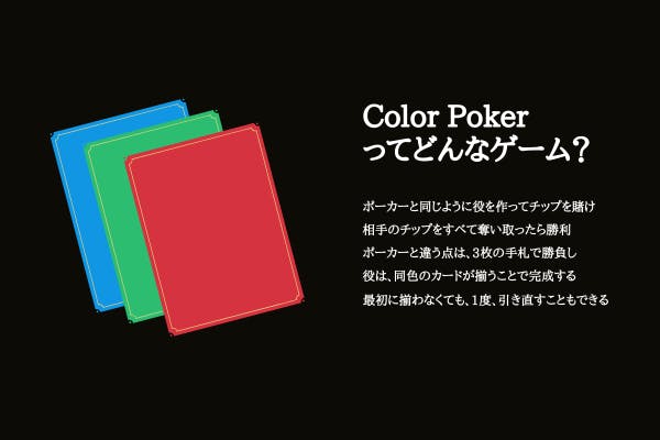 5色のカードを使ったポーカーのカードゲームです。プレイヤーの中でターンごとに最も手札が強い人が勝利していきチップを奪い合う「新・改訂版のポーカー」です。