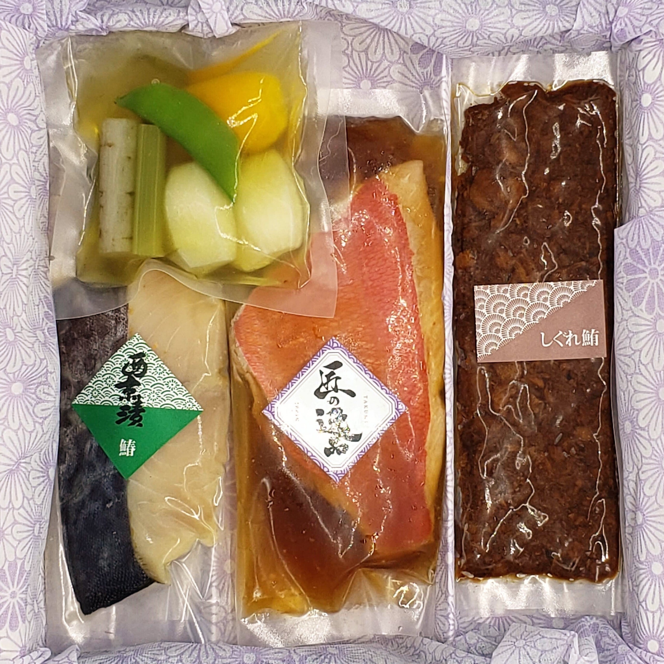 劇場でも人気の鰆の西京漬け、マグロのしぐれ煮、野菜の煮物に加えて目利きのプロが選んだ金目鯛の煮付けが入った満足感の高いセットです。