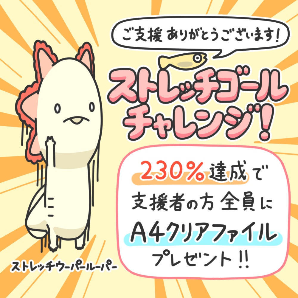 2022/04/08 18:38たくさんのご支援をいただきましたおかげで、目標金額およびストレッチゴールを達成することができました!達成のお礼として、「ご支援いただいた皆様へA4クリアファイルのプレゼント」を実施させていただきます!ぬいぐるみ含め、リターン品の準備をしてまいりますので、お届けまで楽しみにお待ちいただければと思います。たくさんのご支援まことにありがとうございました。 もっと見る